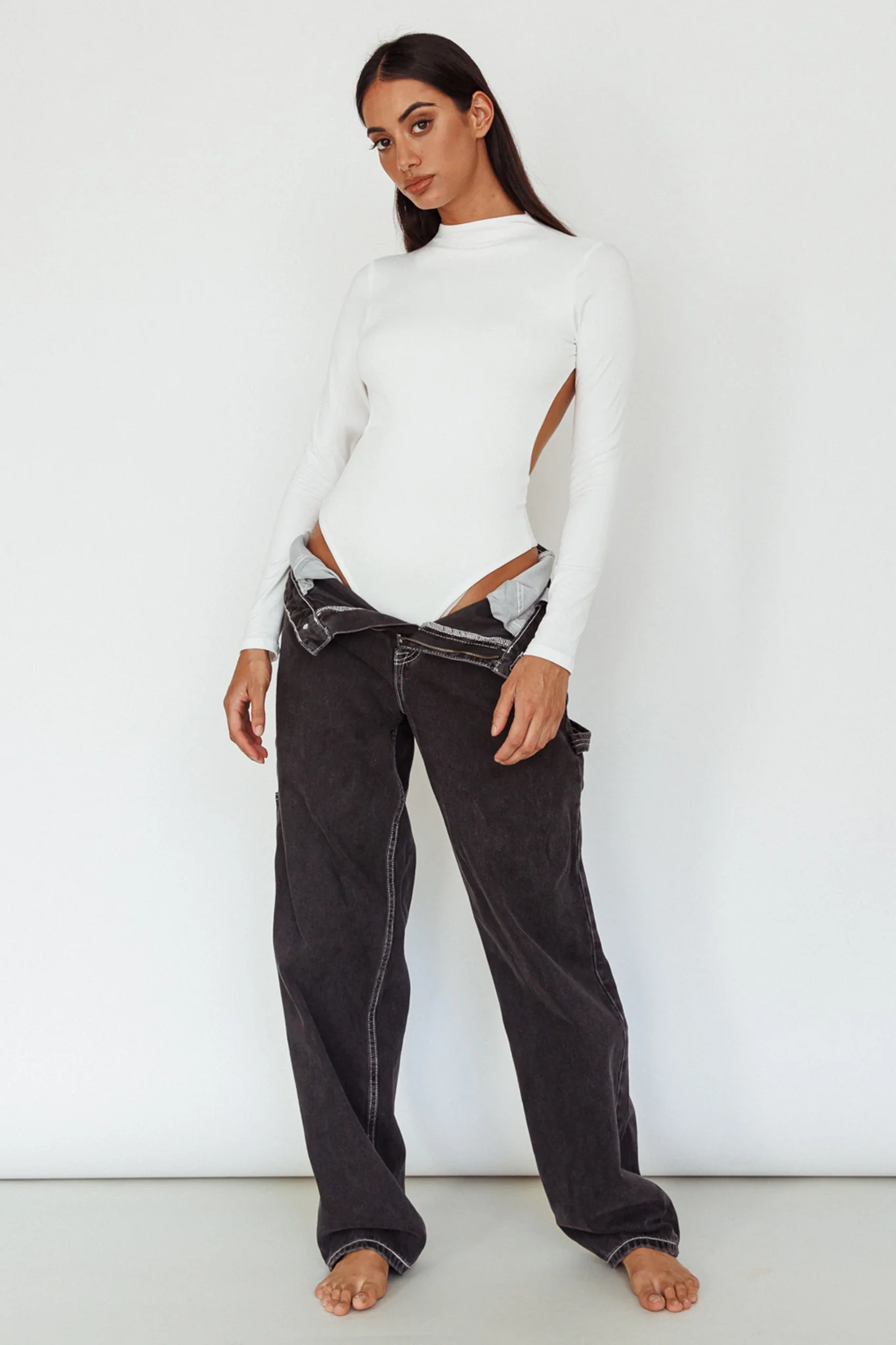 Bobbi Long Sleeve Ruched Side Ribbed Bodysuit White
