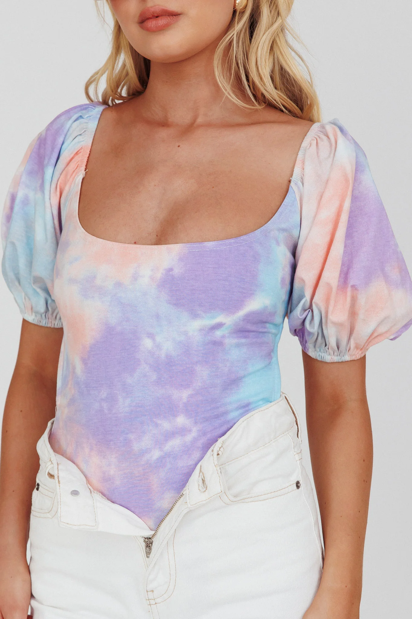Just A Glimpse Puff Sleeve Open Back Bodysuit Tie-Dye Purple/Blue