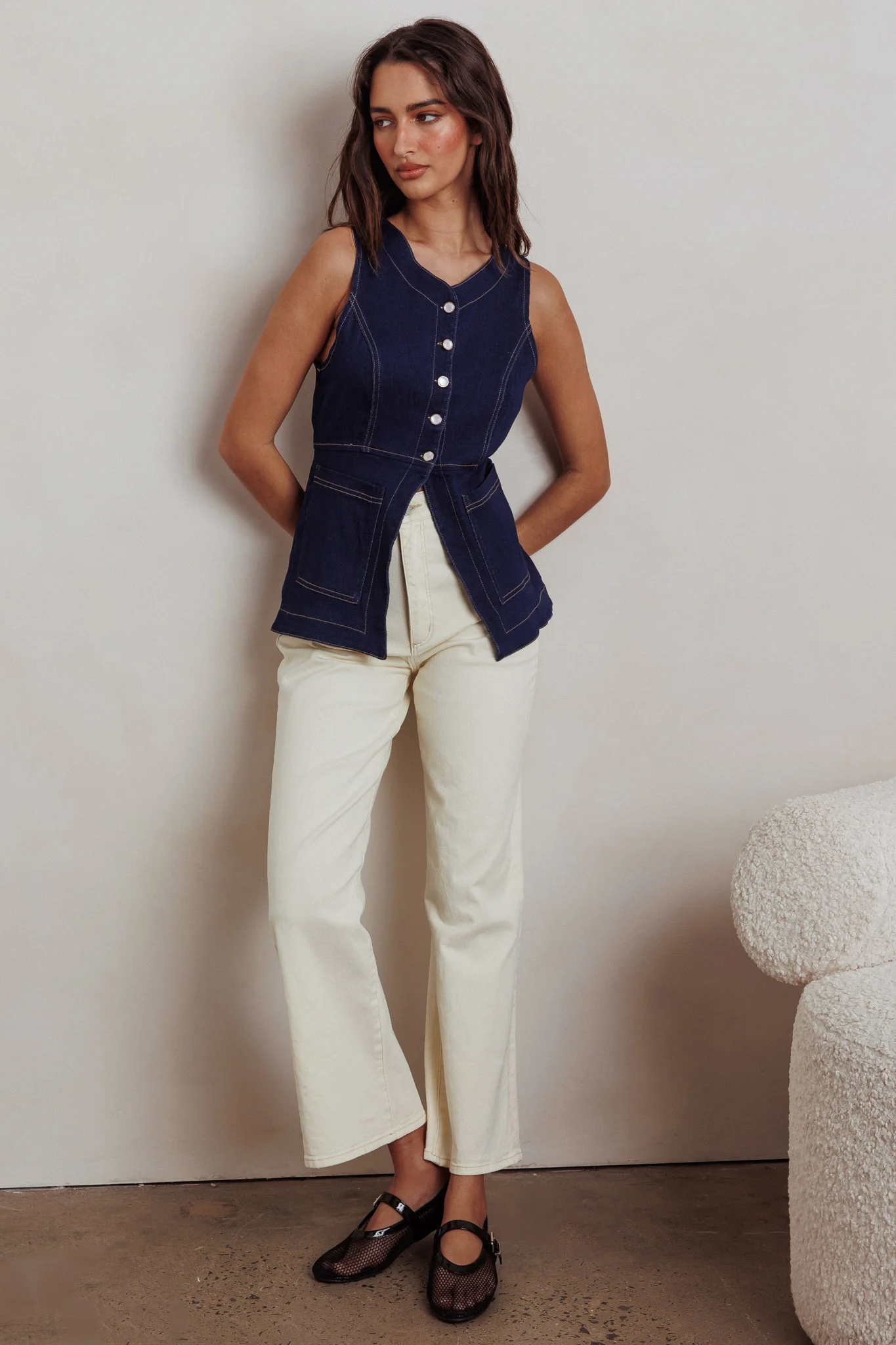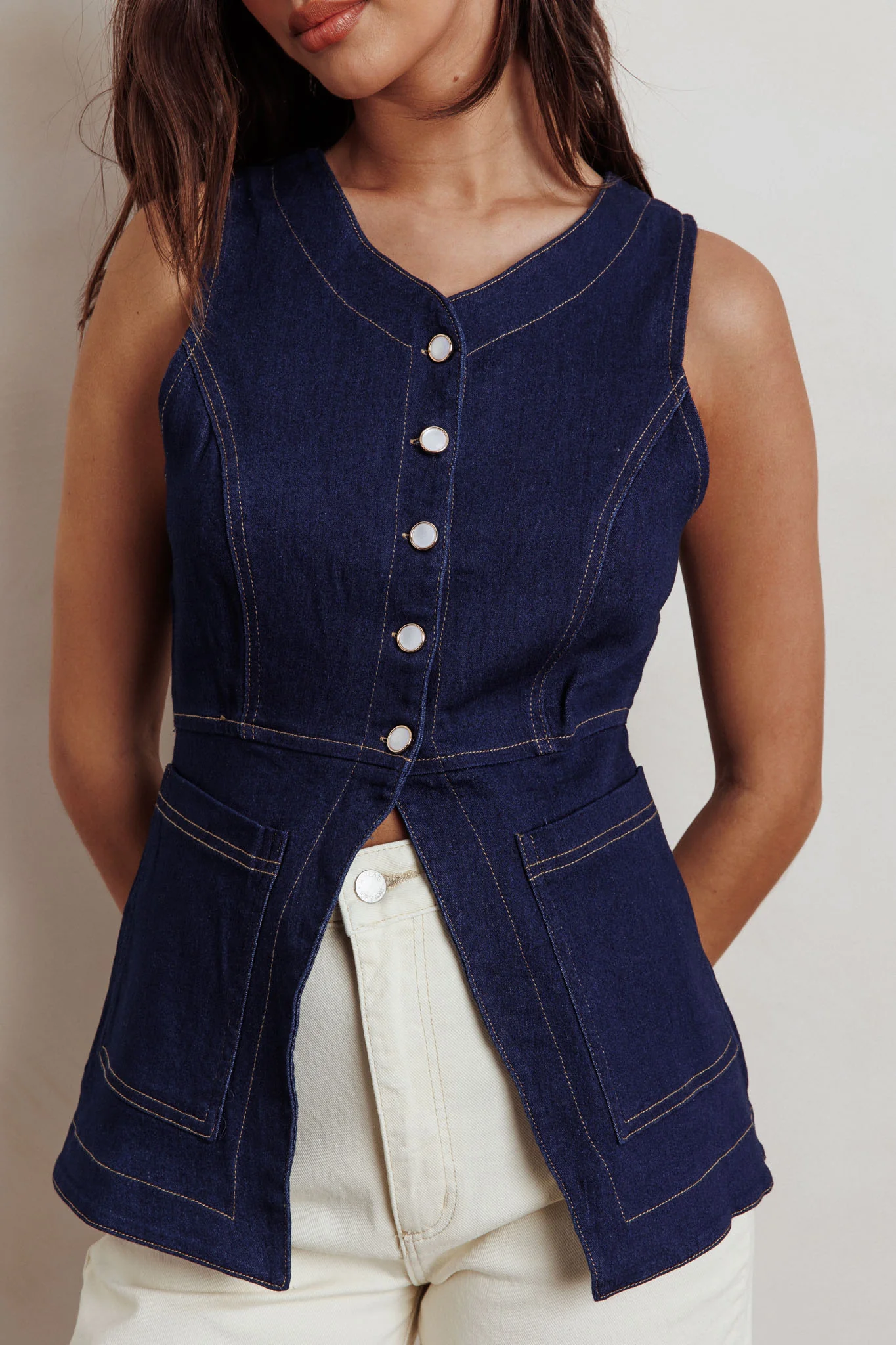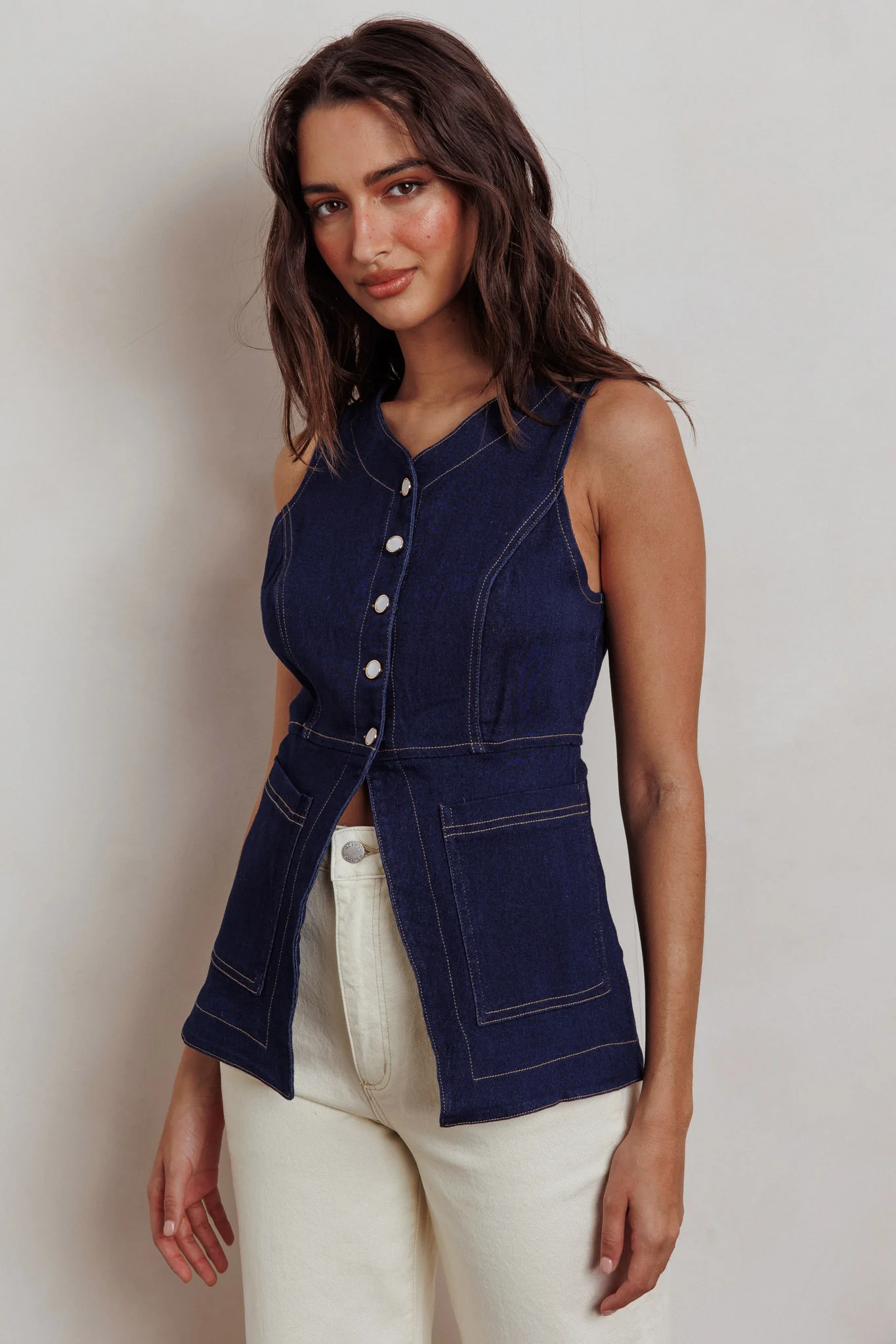 Philomena Button Front Pocket Vest Top Denim