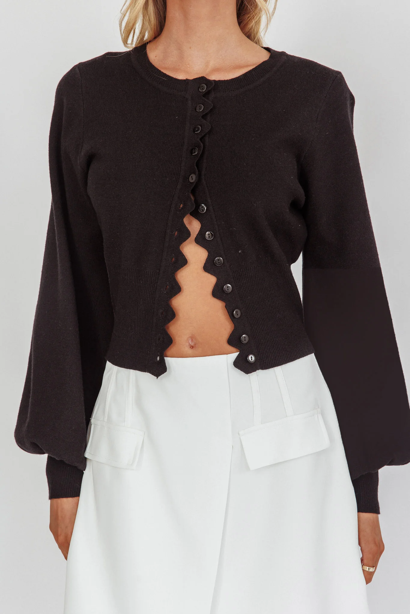 Moonstar Lantern Sleeve Scalloped Cardigan Black