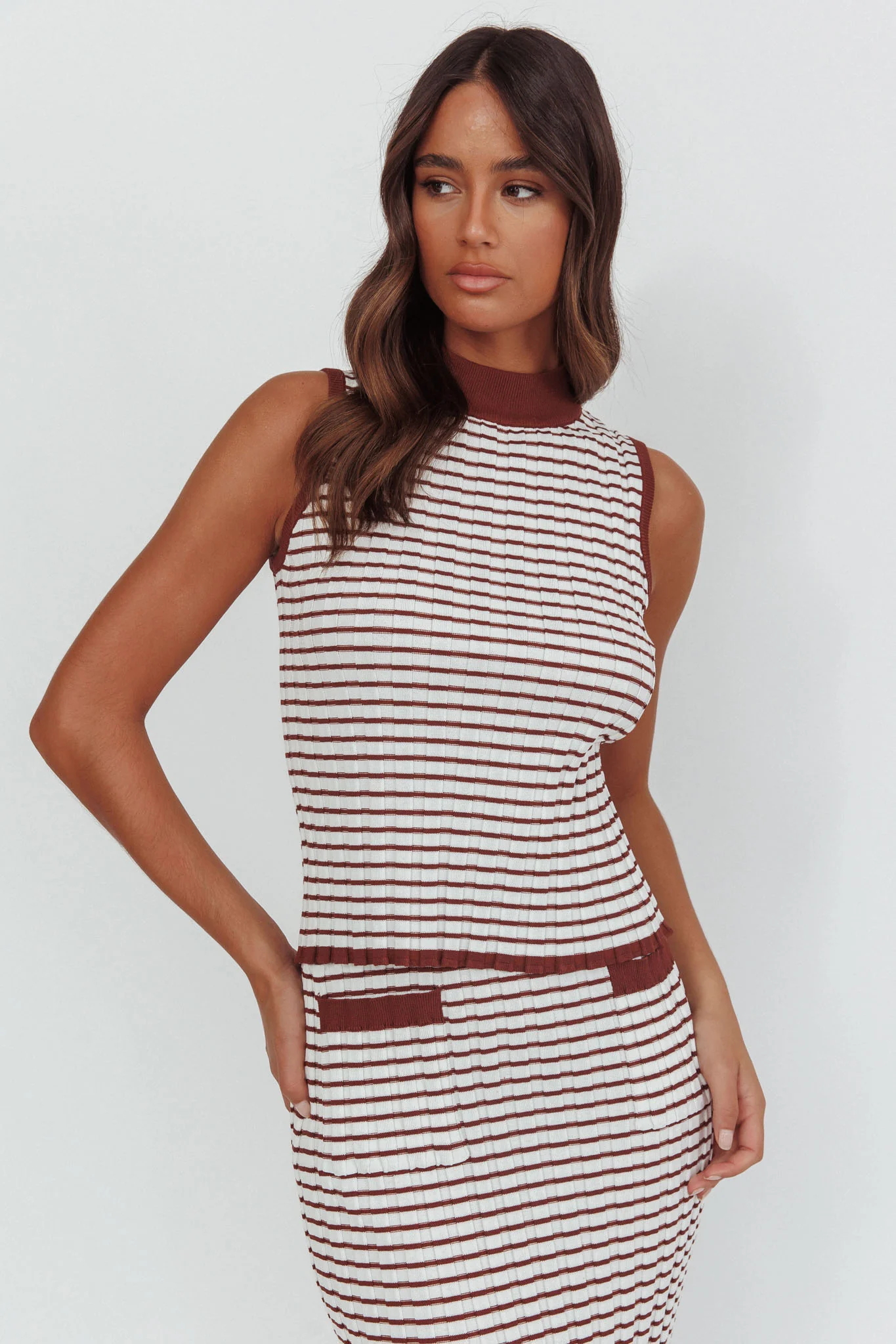 Solar Flare Sleeveless Mock Neck Top Stripe Brown/White