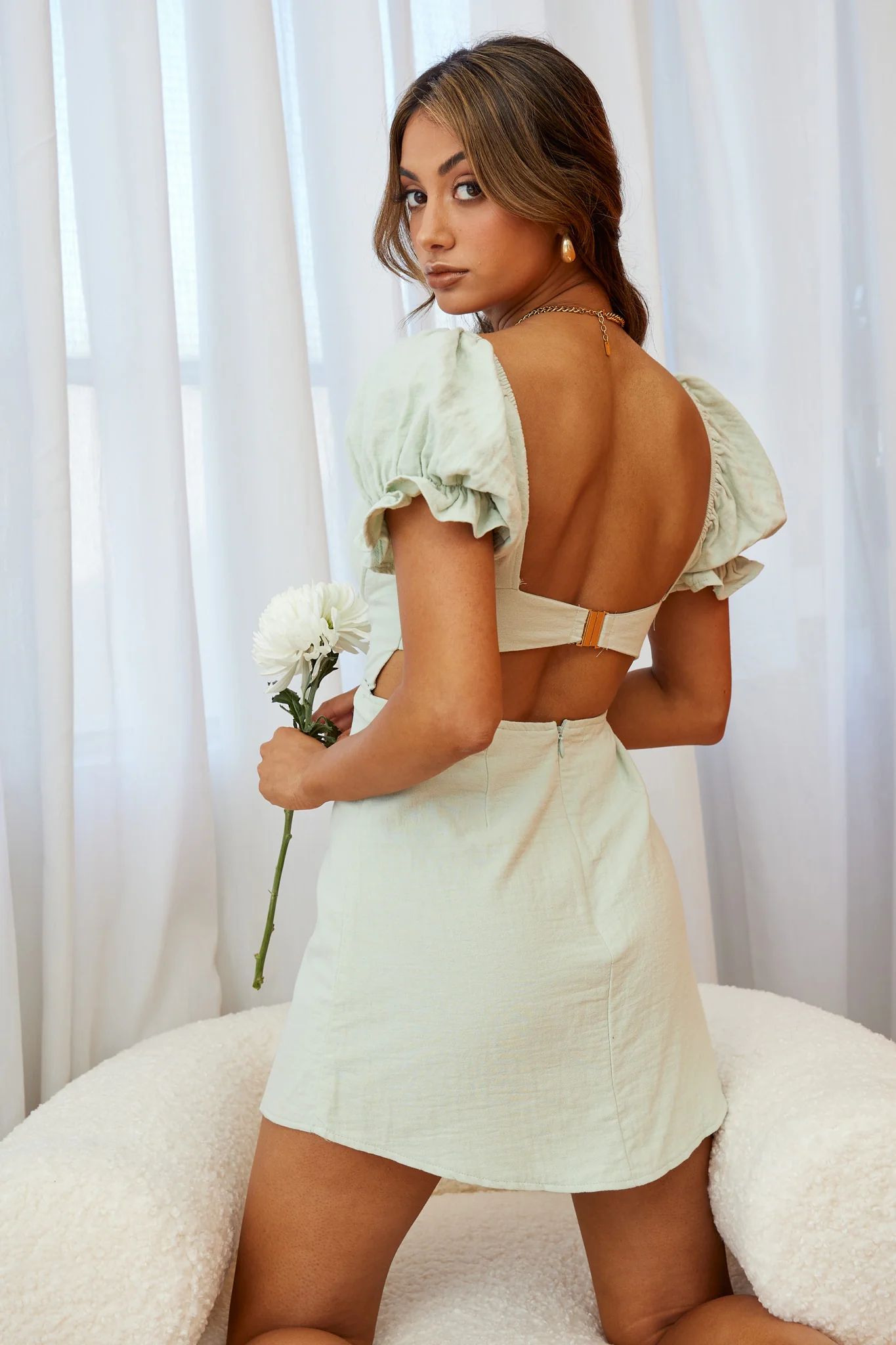 In My Dreams Puff Sleeve String Tie Bust Velour Dress Green