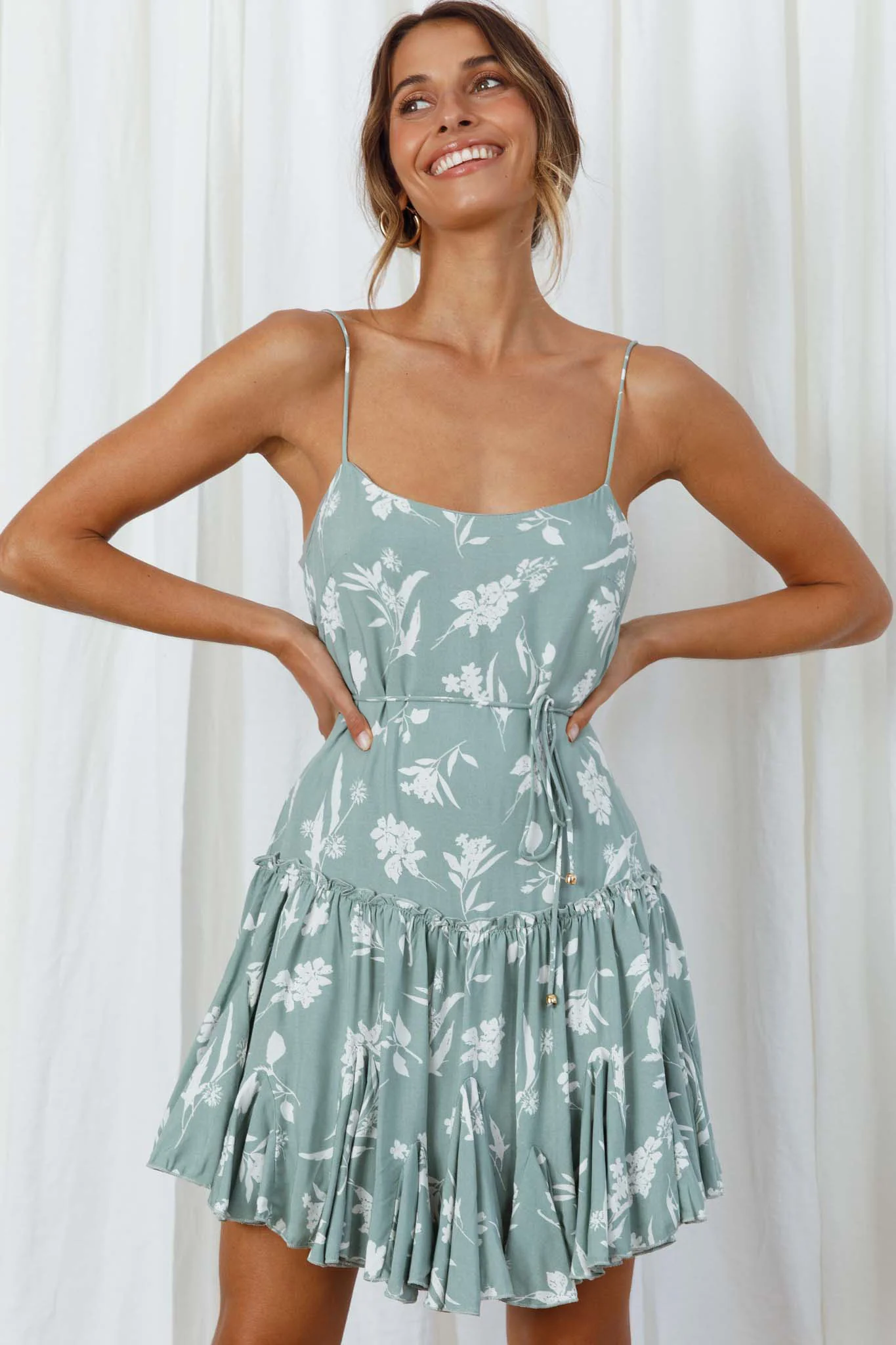 Rosabel Spaghetti Strap Fluted Hem Dress Floral Print Sage