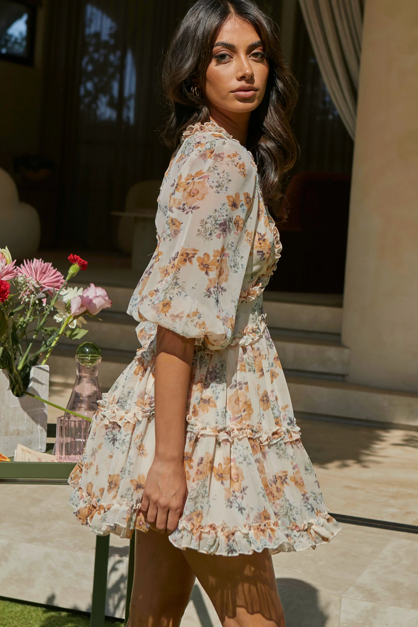 Laney Cutout Back Ruffle Trim Dress Vintage Floral Print Beige