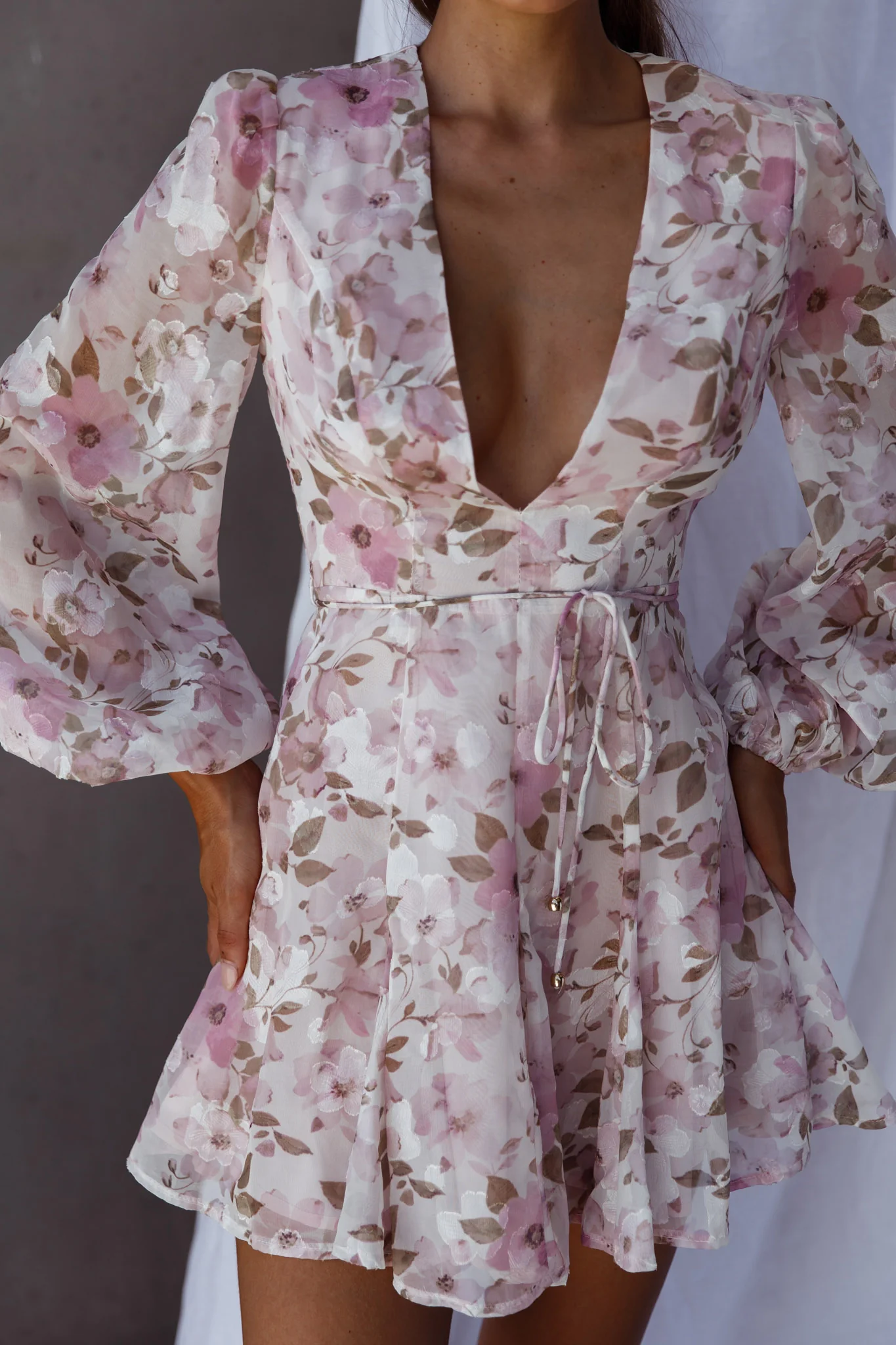 Good Vibes Puff Sleeve Deep V-Neckline Mini Dress Floral Print Pink