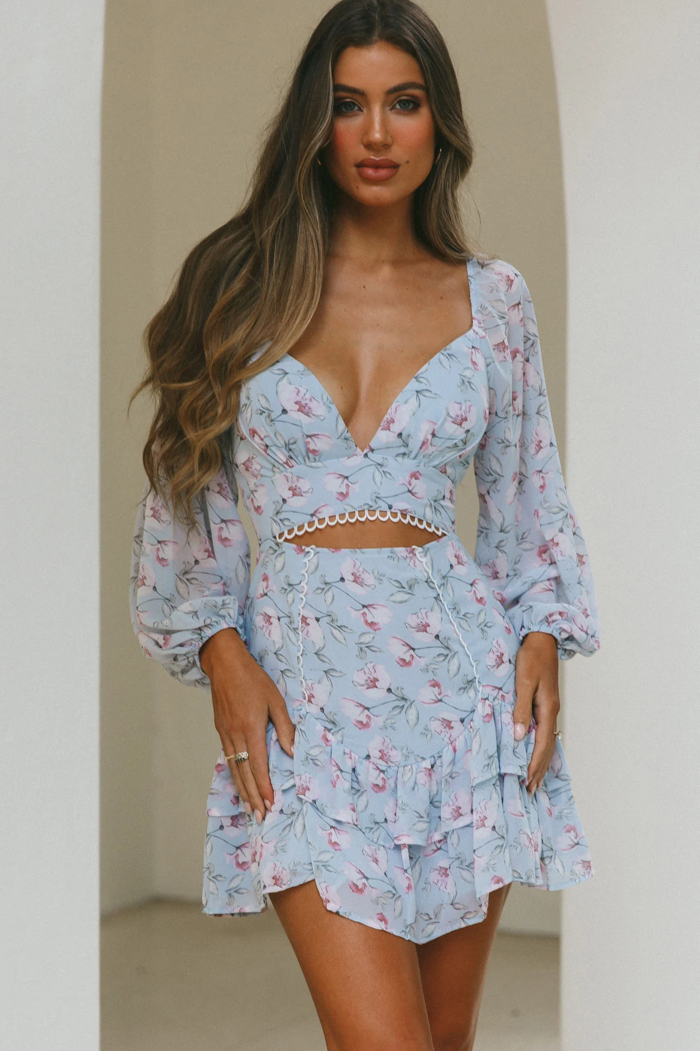 Dearly Beloved Balloon Sleeve Layered Frill Hem Dress Flower Print Blue