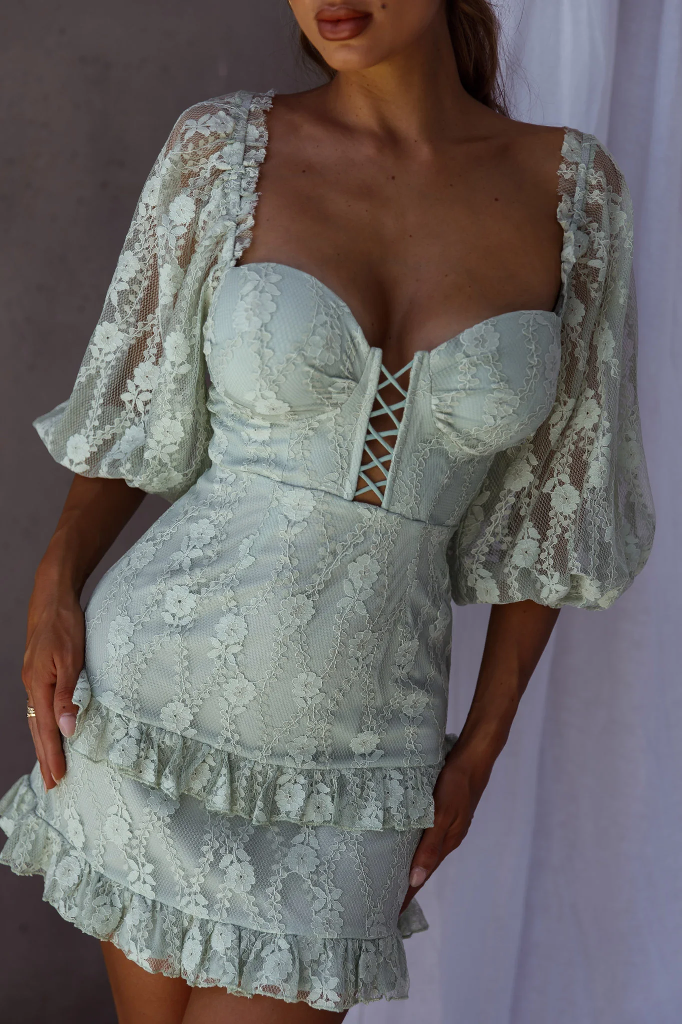 Hemingway Criss-Cross Bust Balloon Sleeve Frill Trim Lace Dress Sage