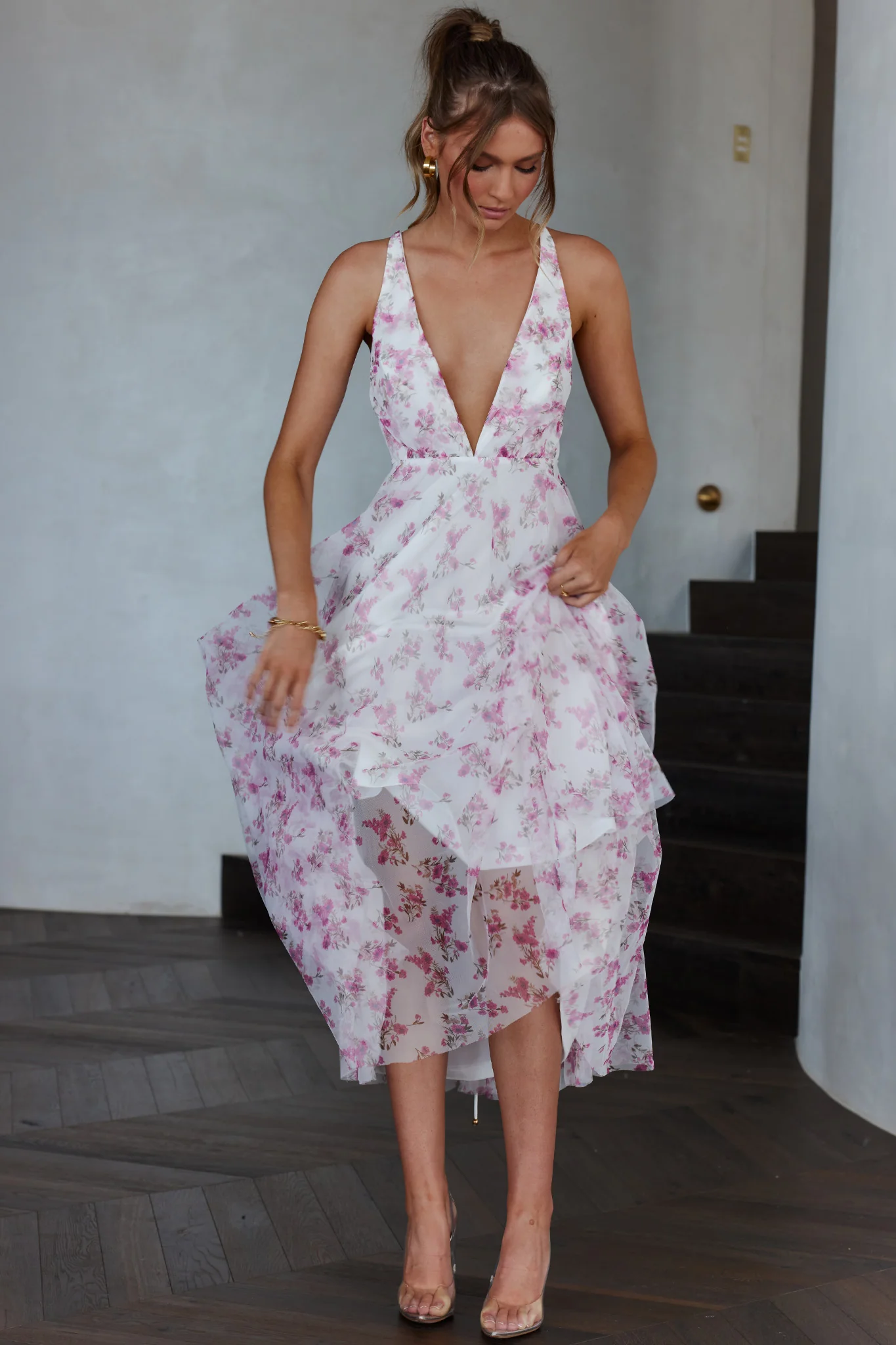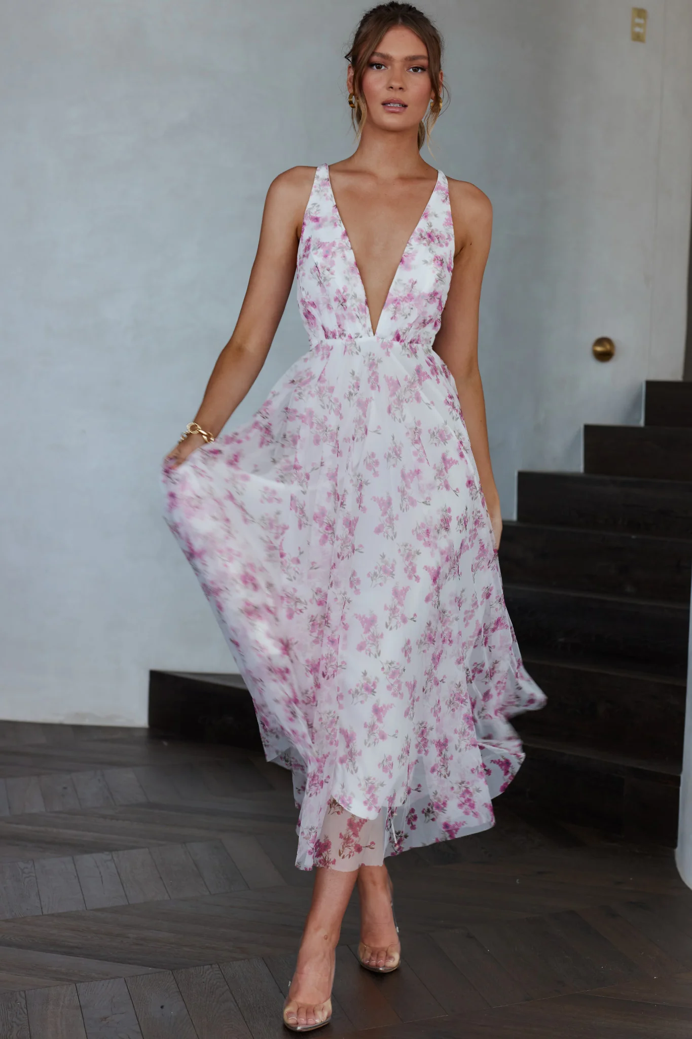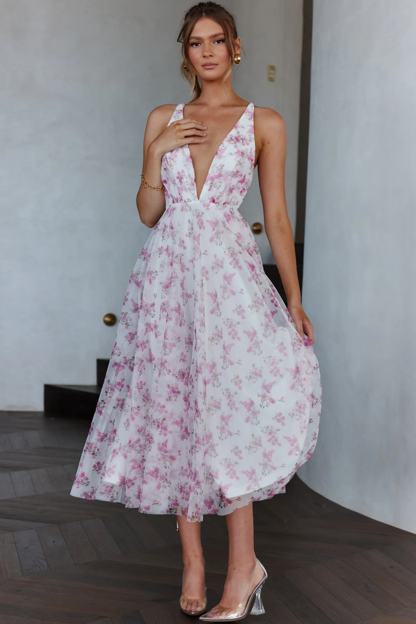 Floating By Plunging Neckline Midi Dress Floral Pink