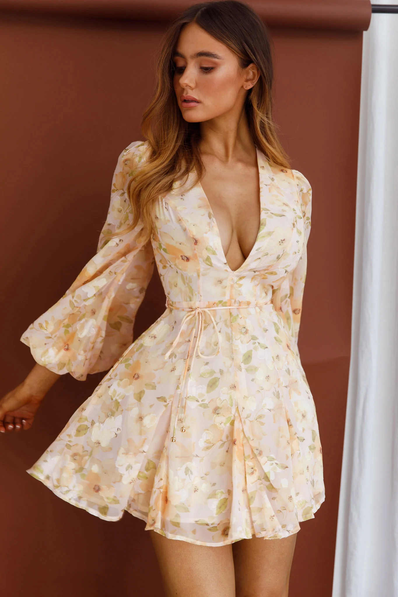 Estelle Long Sleeve V-Neckline Dress Watercolor Floral Print Peach