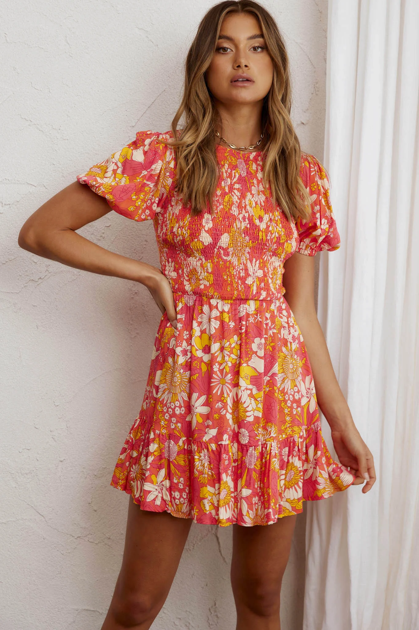 Crystal Shores Shirred Bust Mini Dress Floral Orange