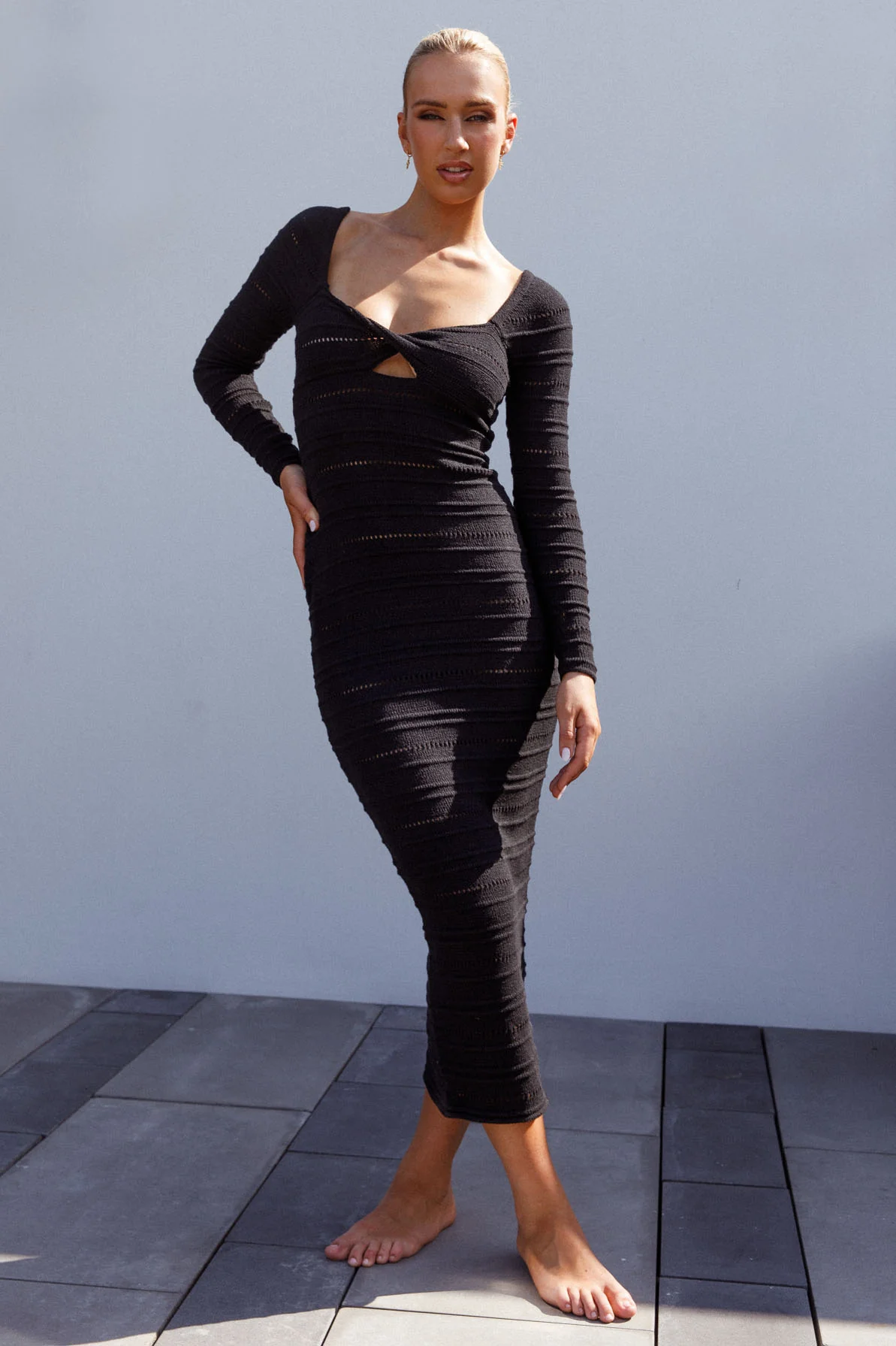 Beachside Crochet Knit Long Sleeve Midi Dress Black