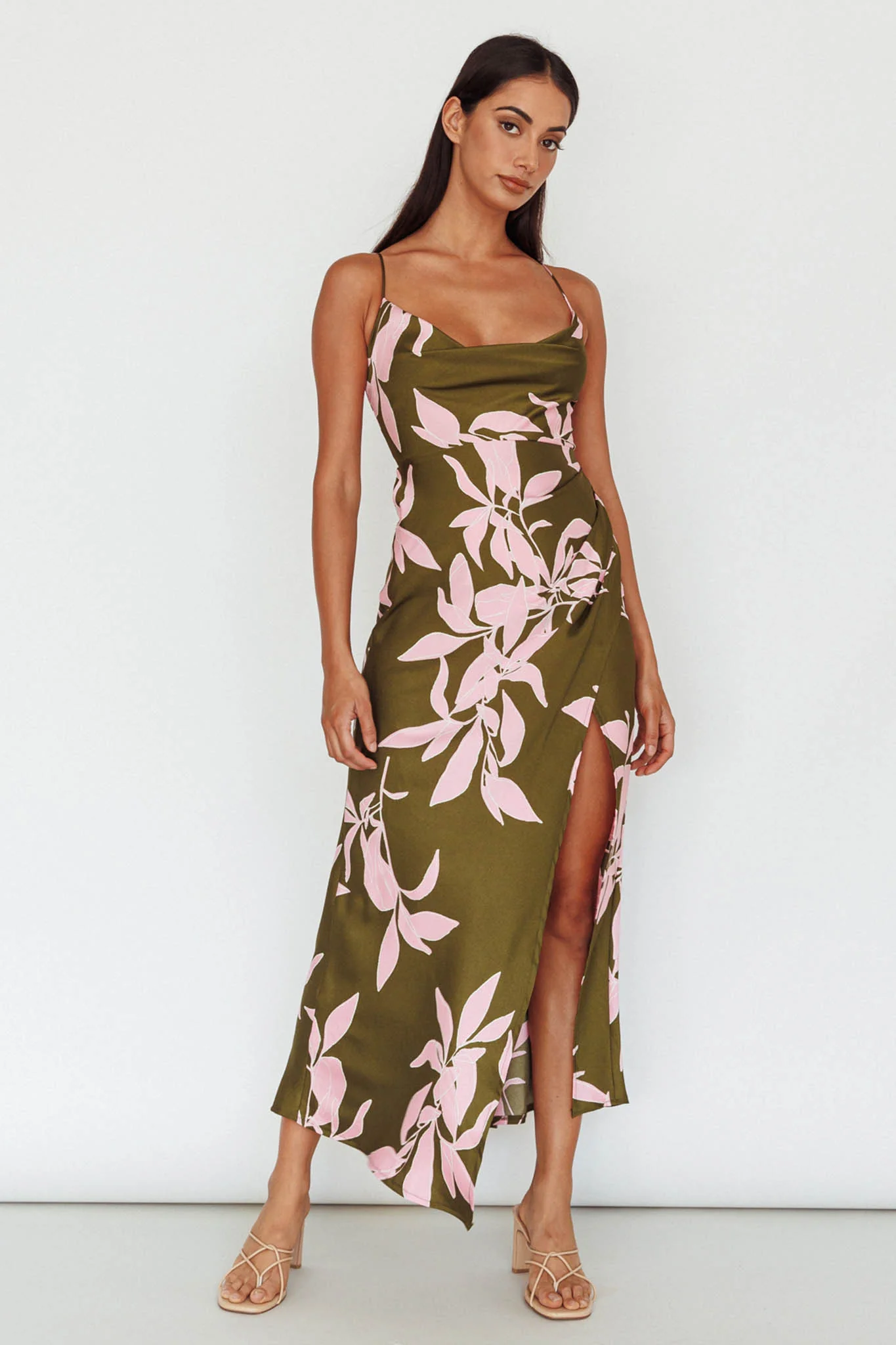 Dream Crush Lace-Up Back Side Split Midi Dress Khaki