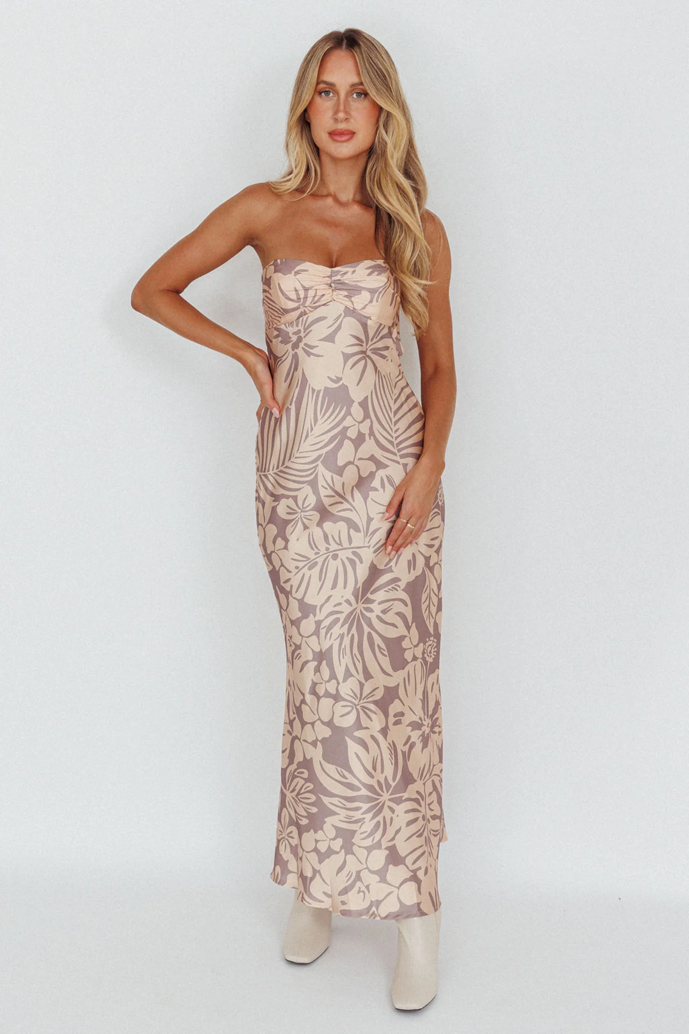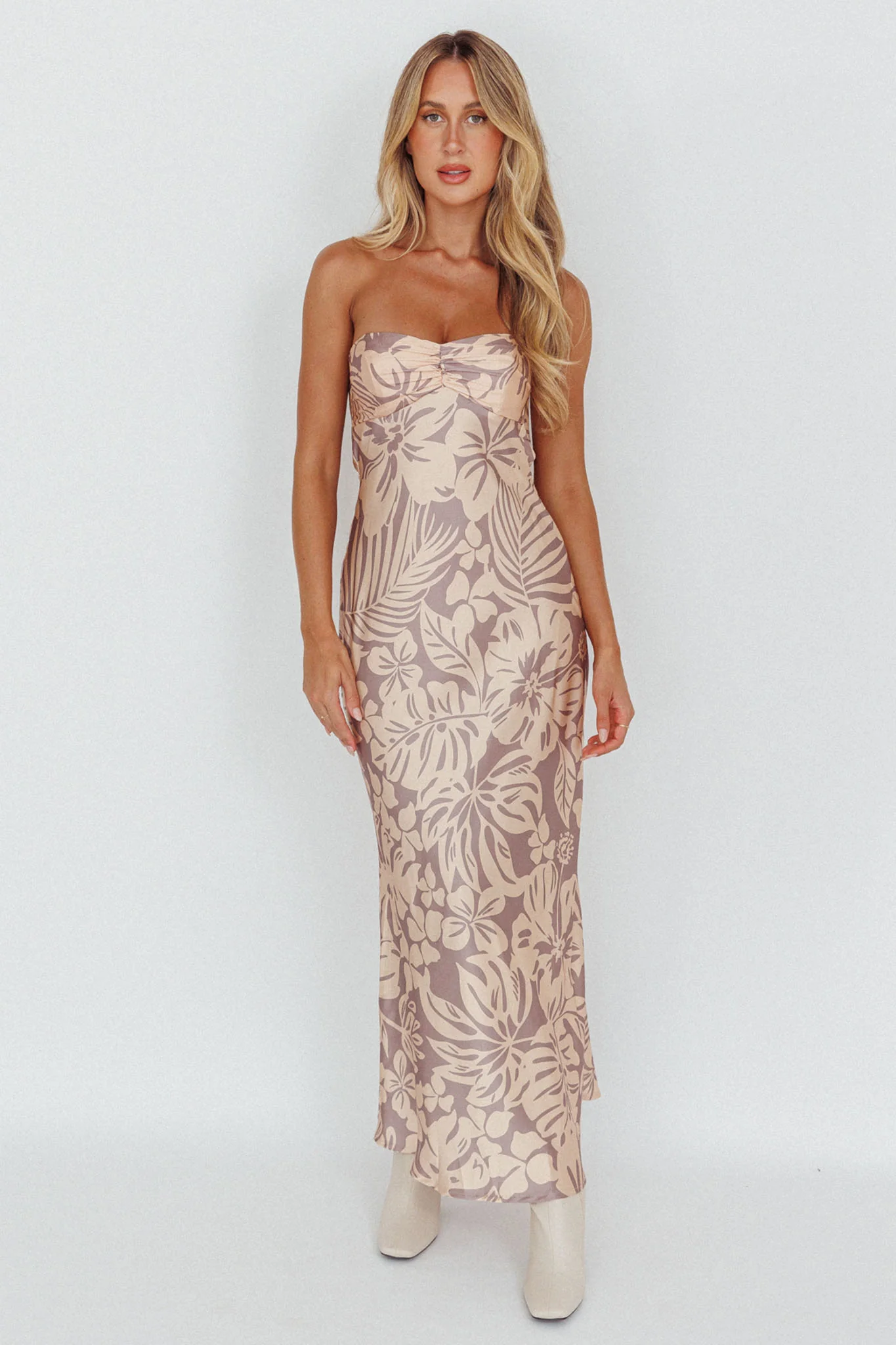 Logan Strapless Ruched Midi Dress Brown