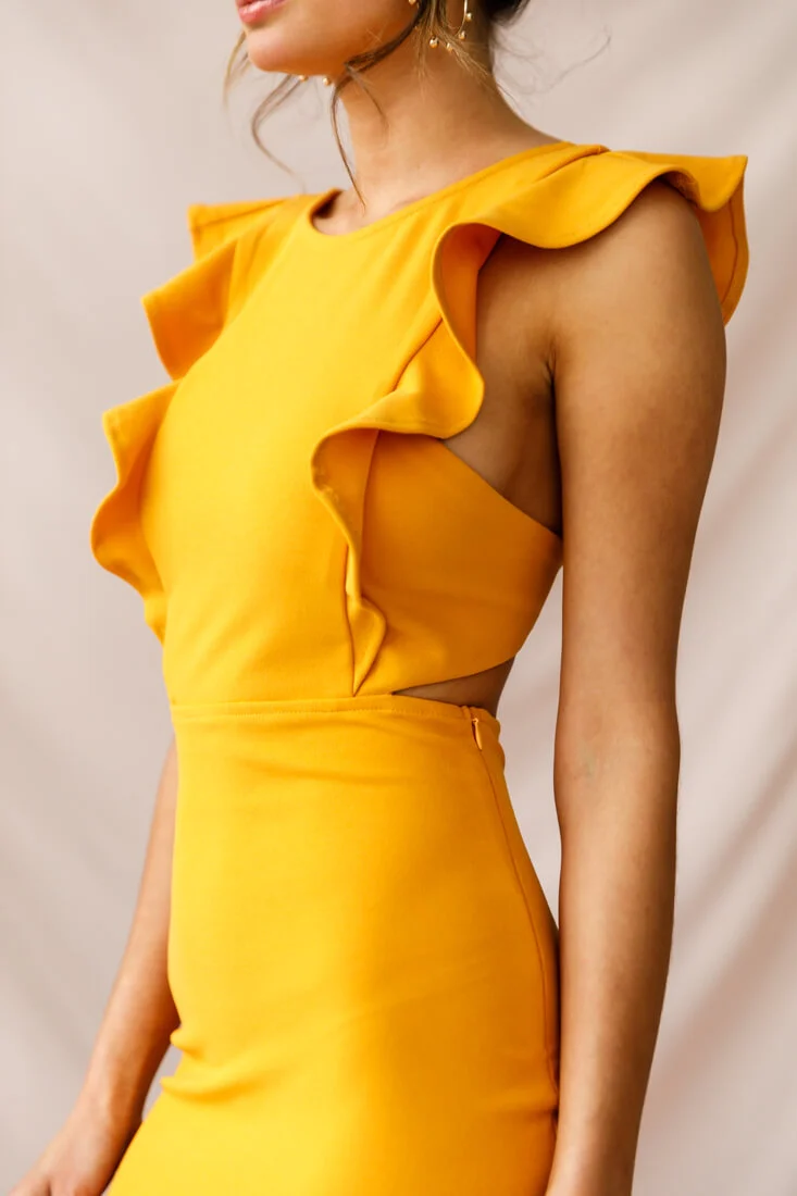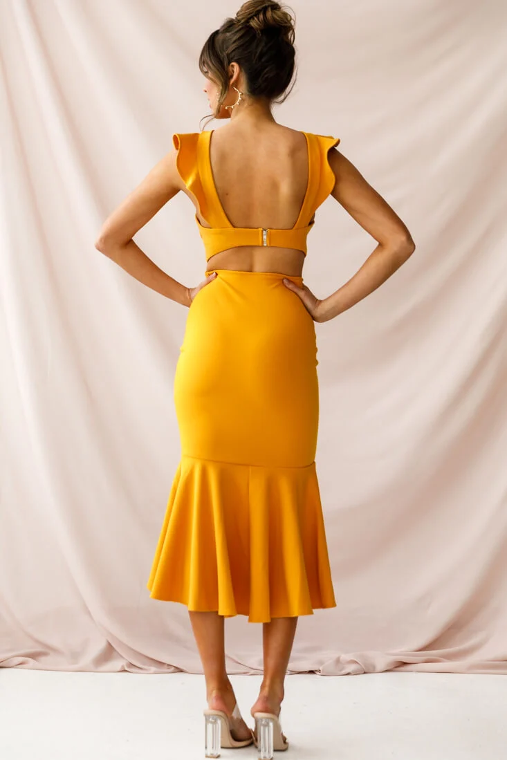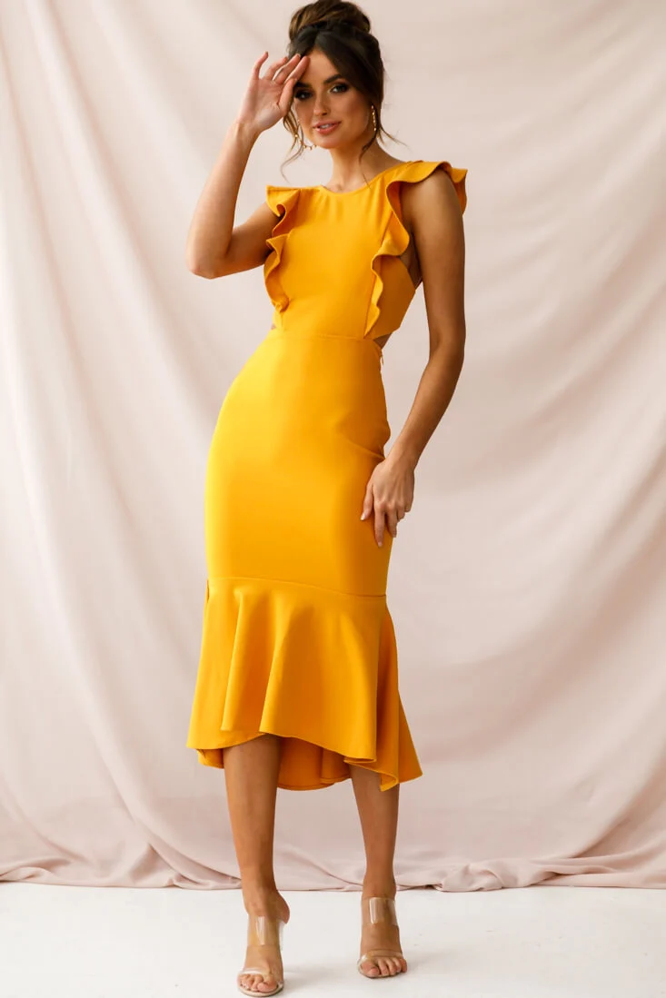 Jackie Wide Ruffle Hem Pinafore Midi Dress Mustard