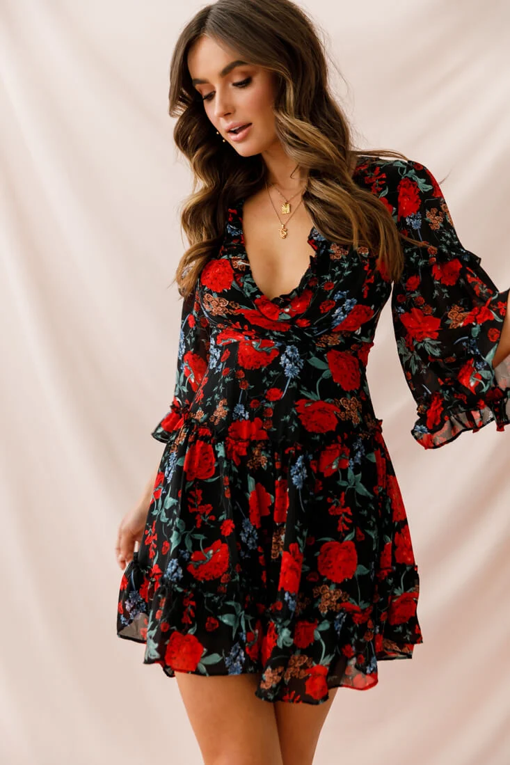 Albany Lace Up Back Frill Dress Black/Red