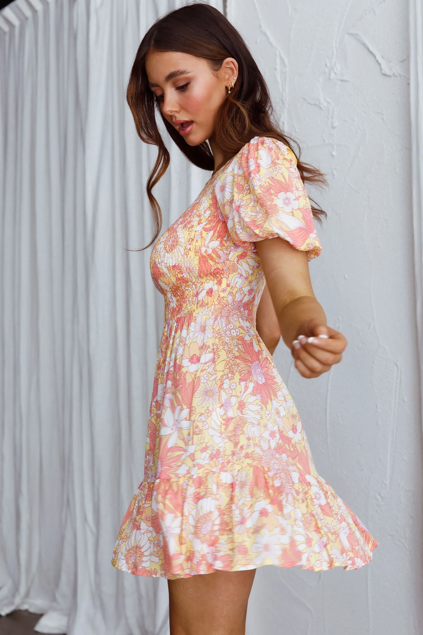 Crystal Shores Shirred Bust Mini Dress Floral Yellow