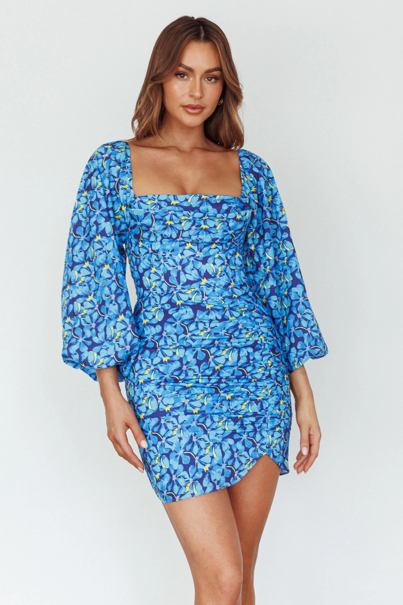 Beaujolais Long Sleeve Ruched Mini Dress Floral Blue