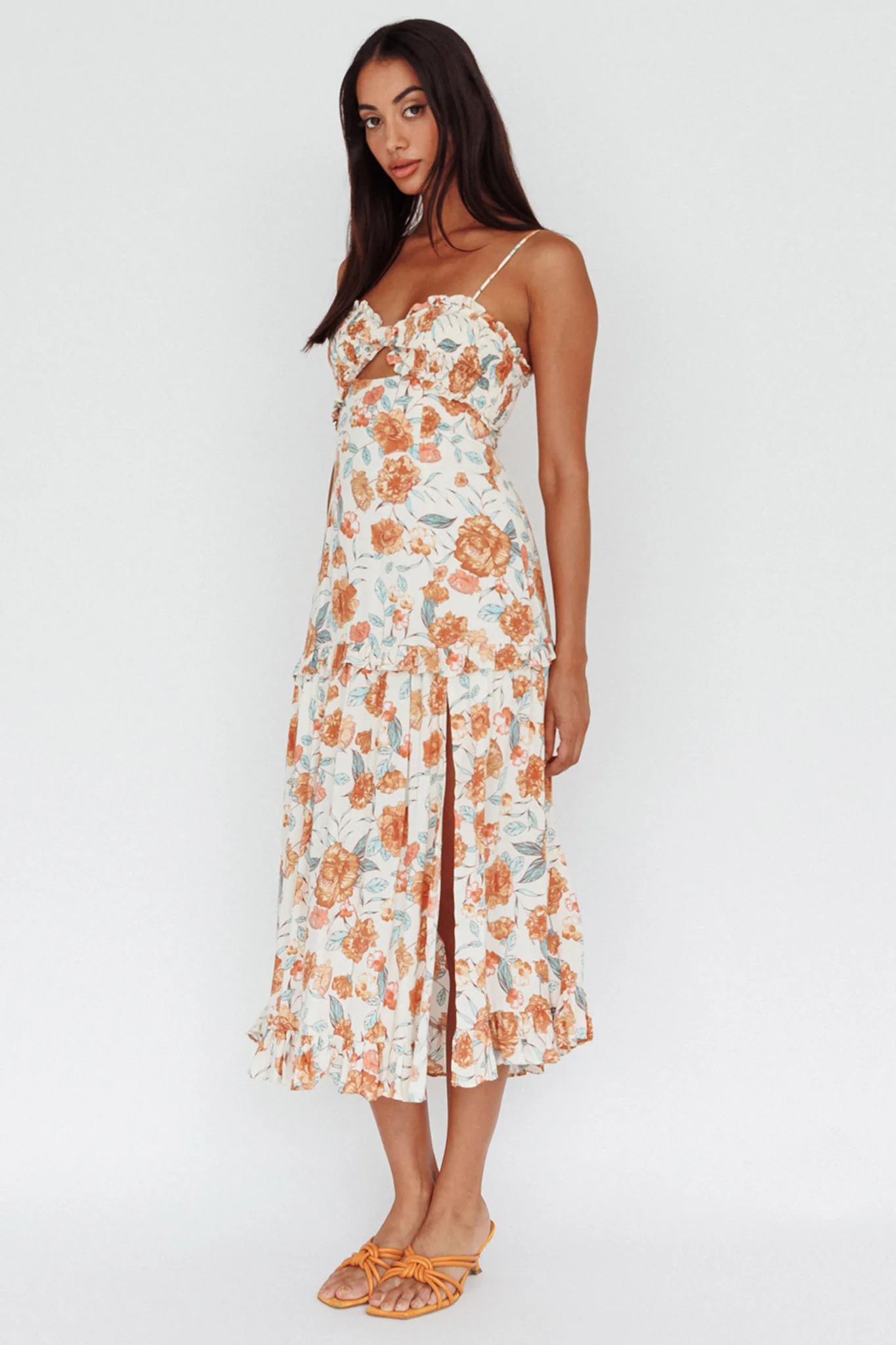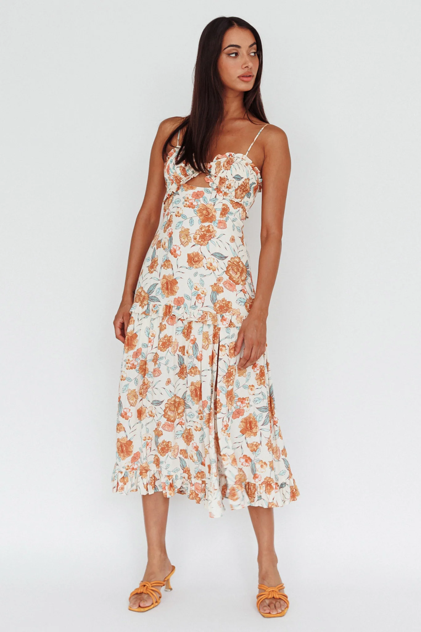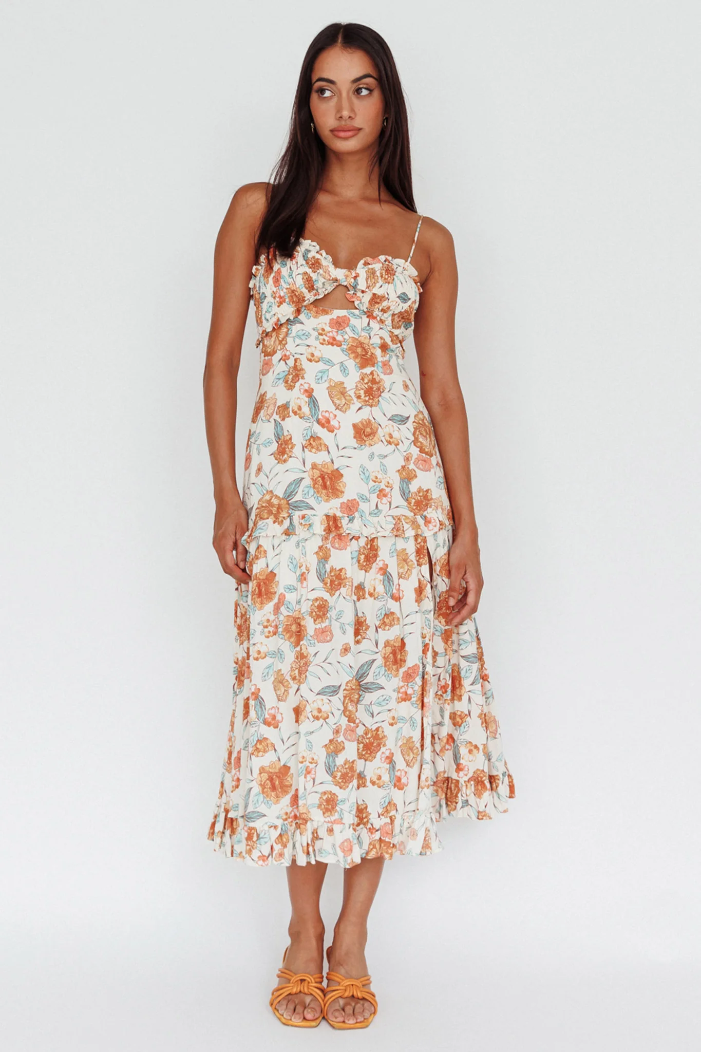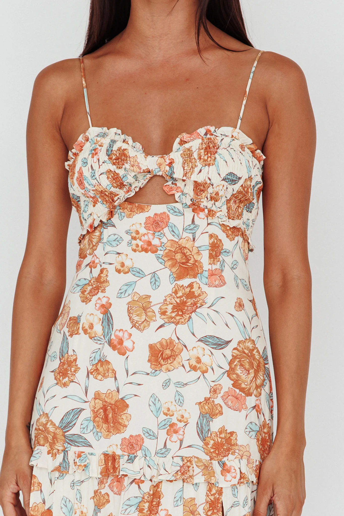 Everglow Shirred Bust Midi Dress Floral Beige