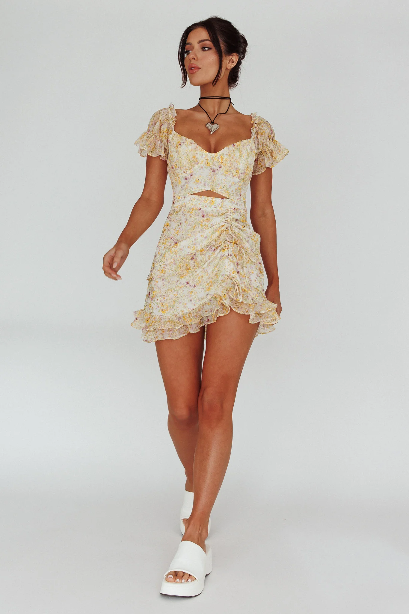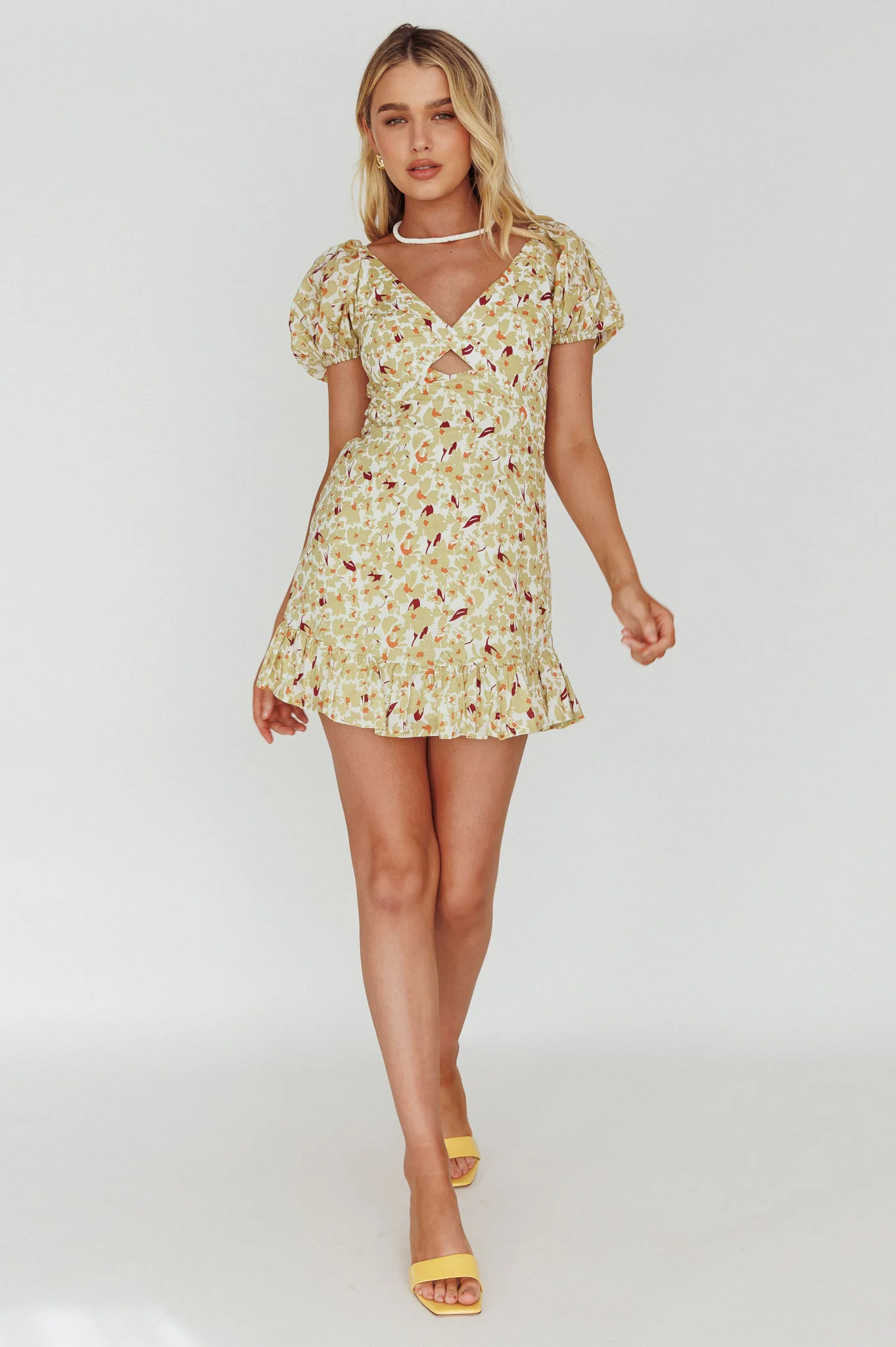 Sarai Twist Bust Ruffle Sleeve Mini Dress Floral Yellow