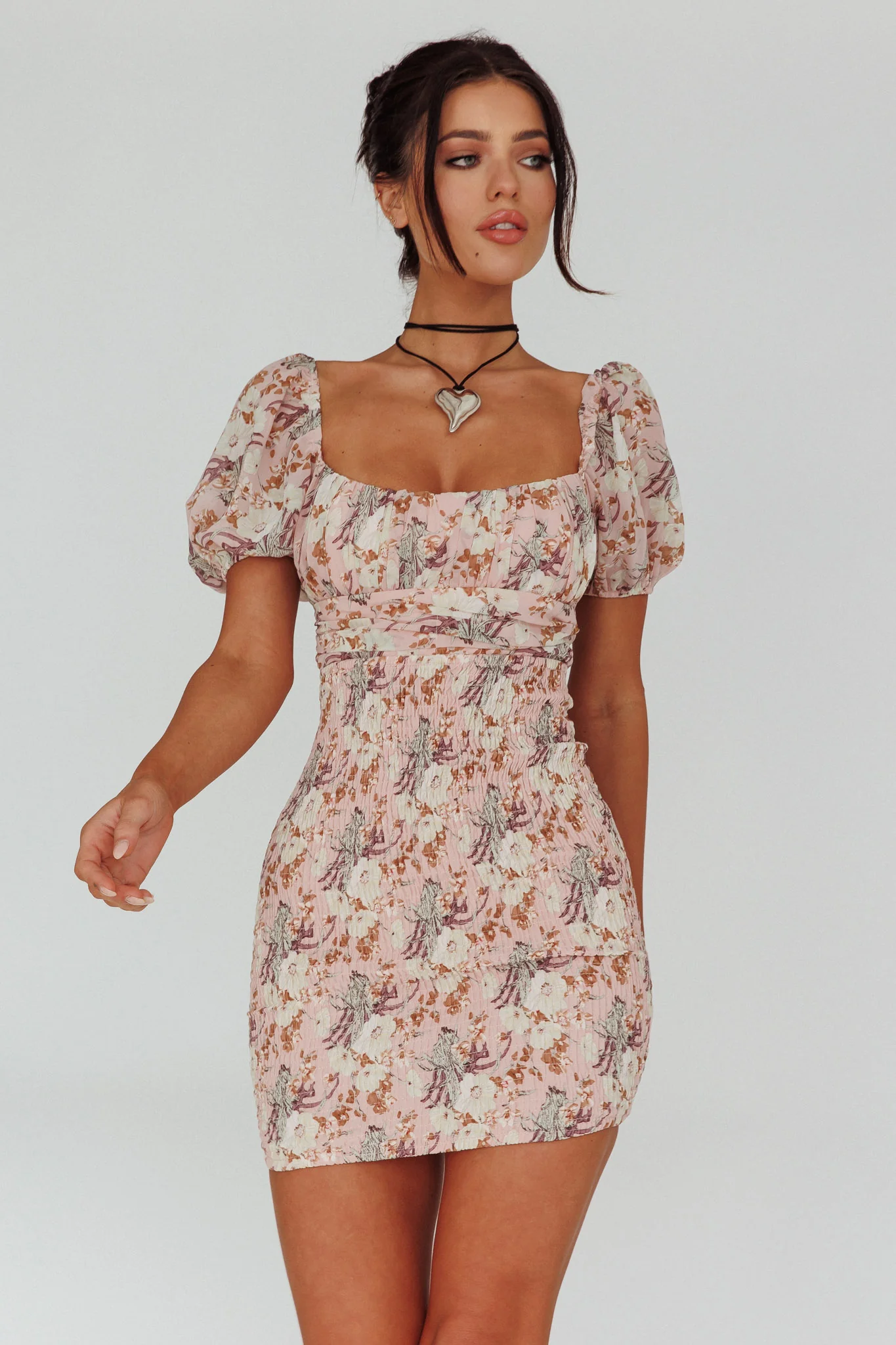 Kirra Puff Sleeve Ruched Bodice Dress Floral Pink