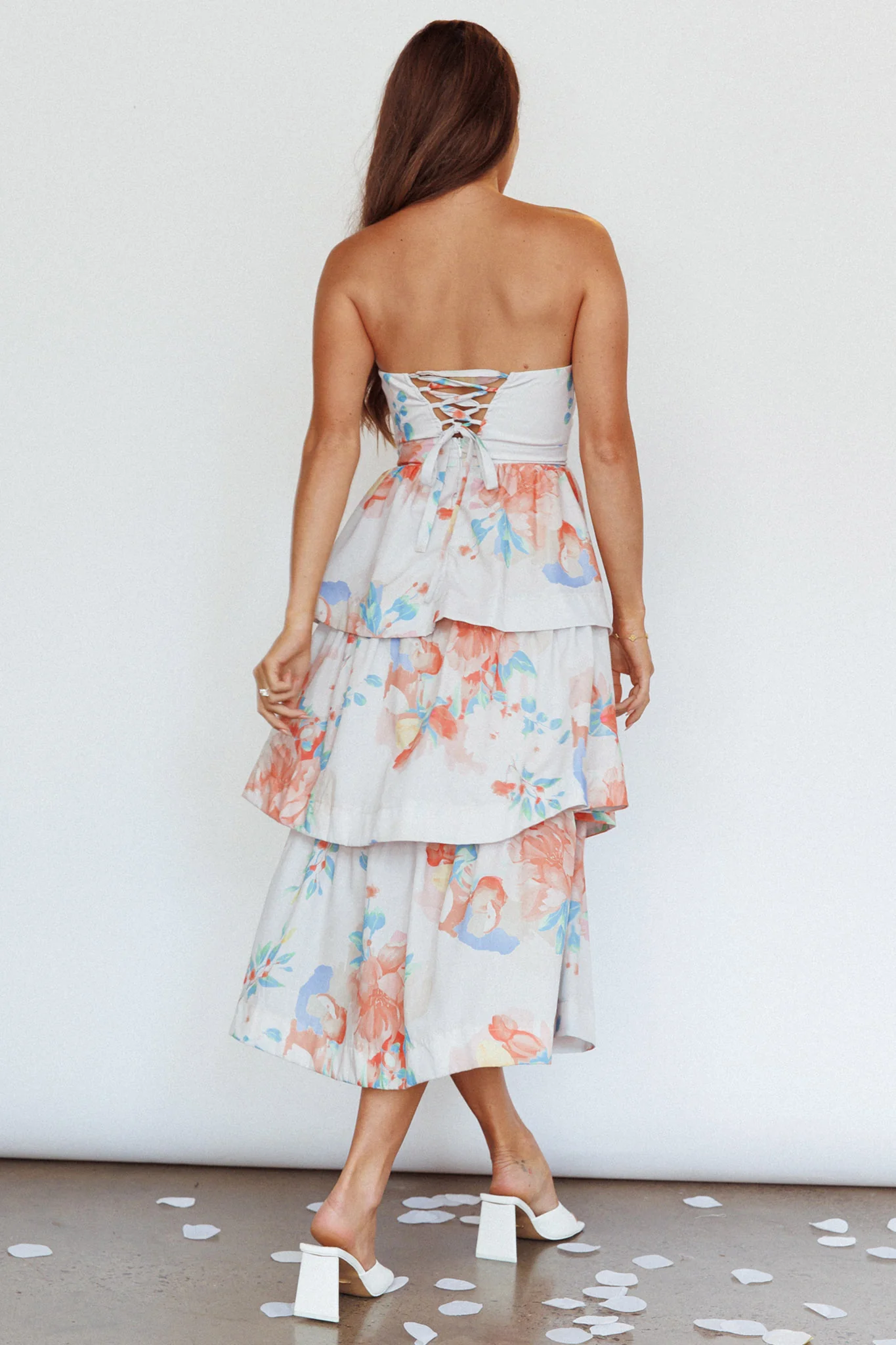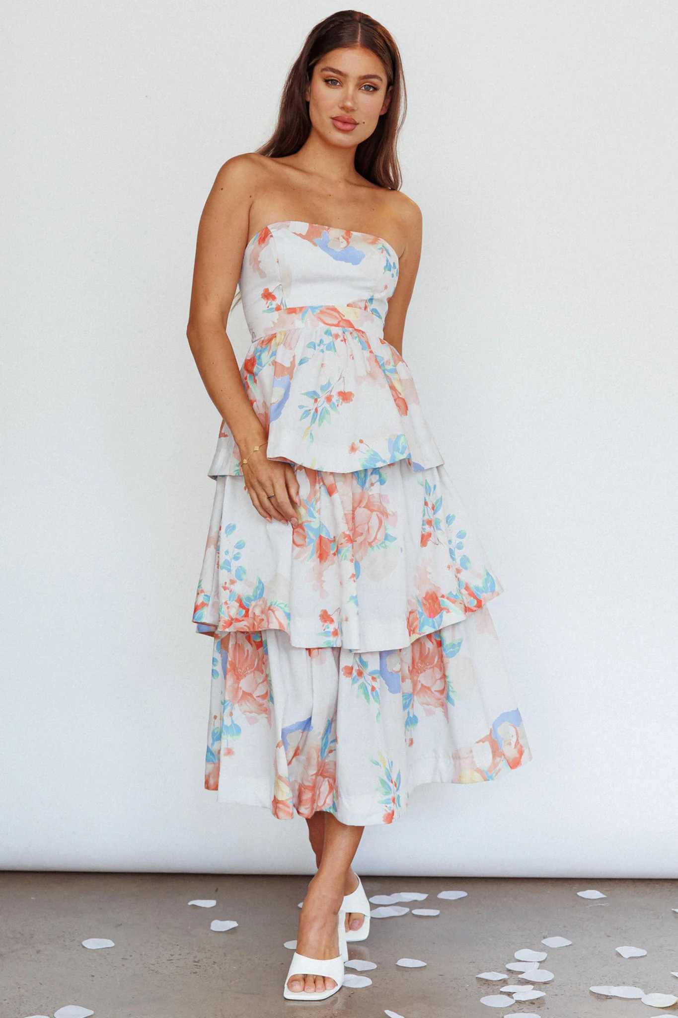 Outshine Strapless Tiered Midi Dress Floral Peach