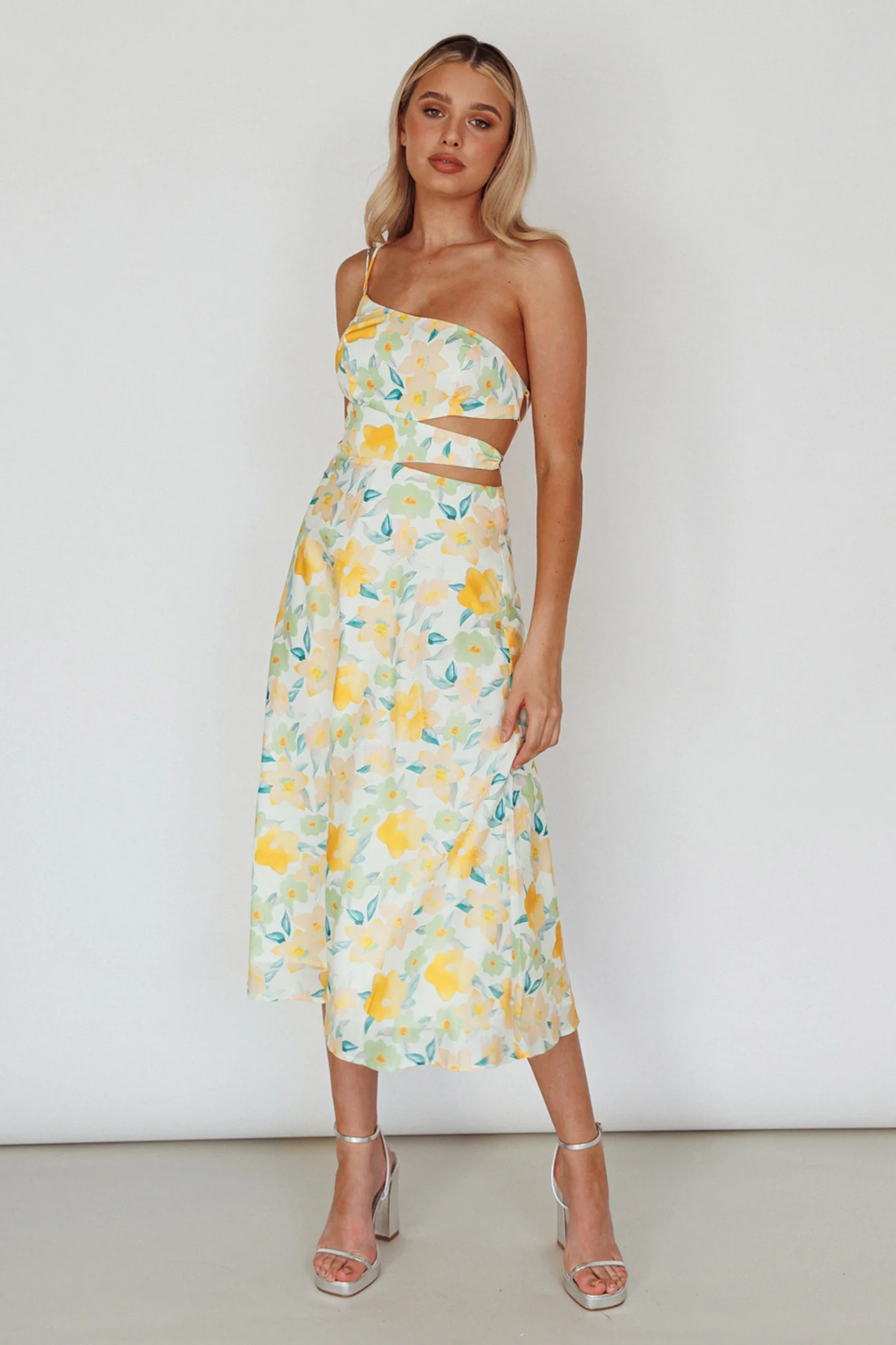 Halia One-Shoulder A-Line Midi Dress Floral Yellow