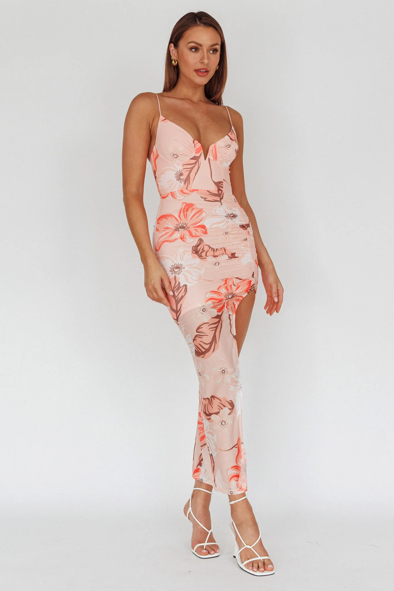 Lake Como Fitted Bodice Side Split Dress Floral Pink