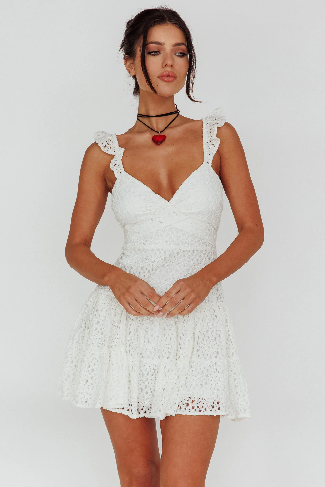 Short Notice Ruffle Strap Lace Mini Dress White