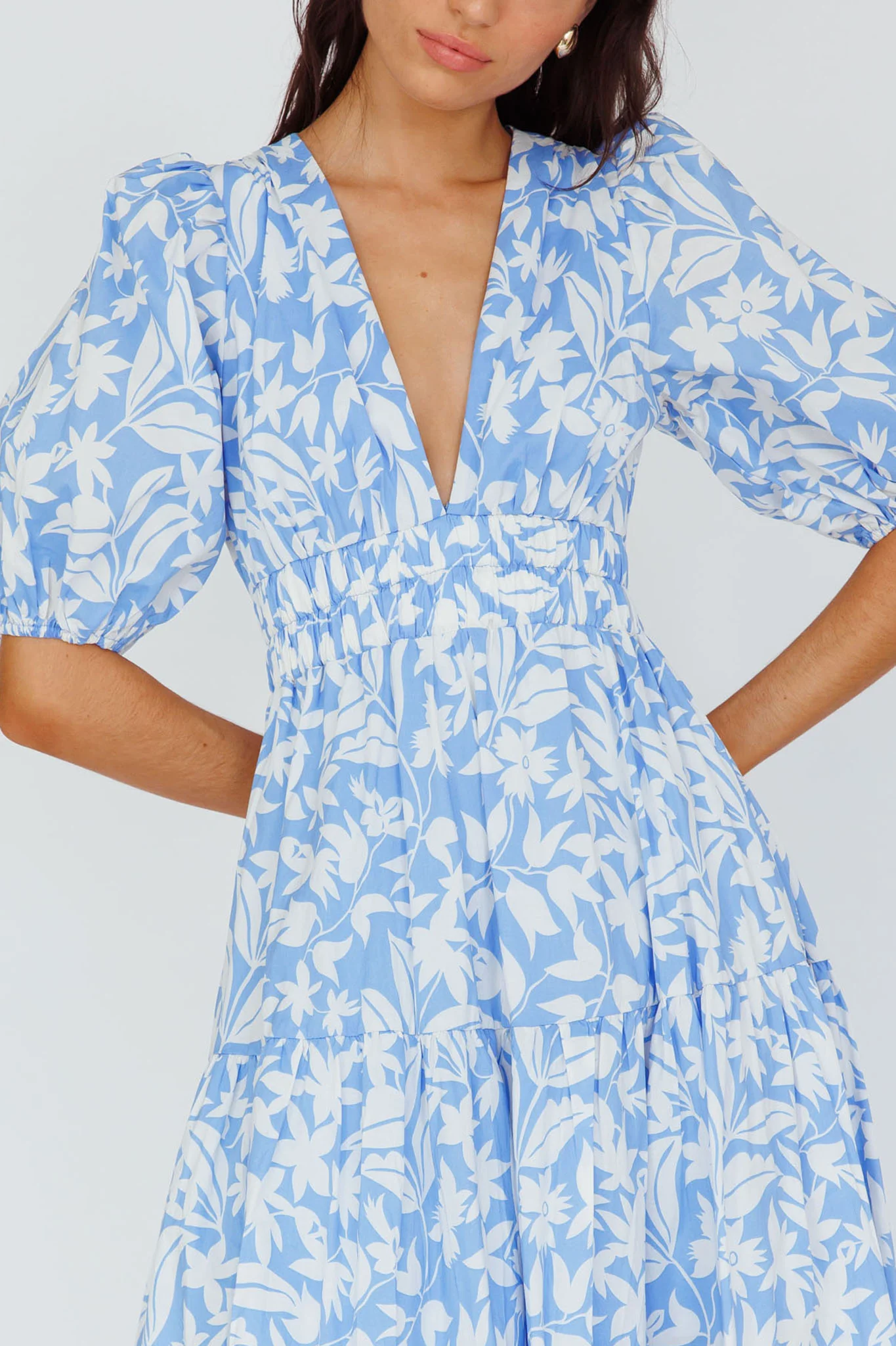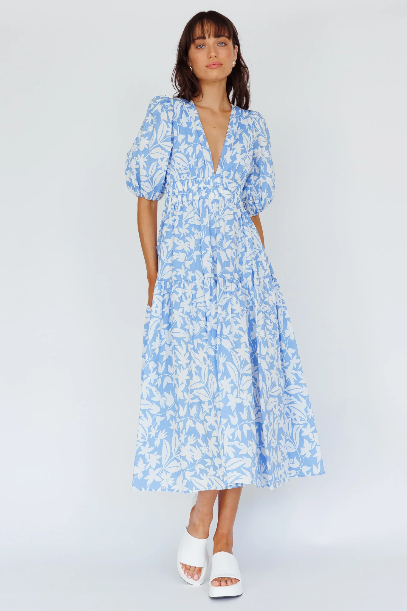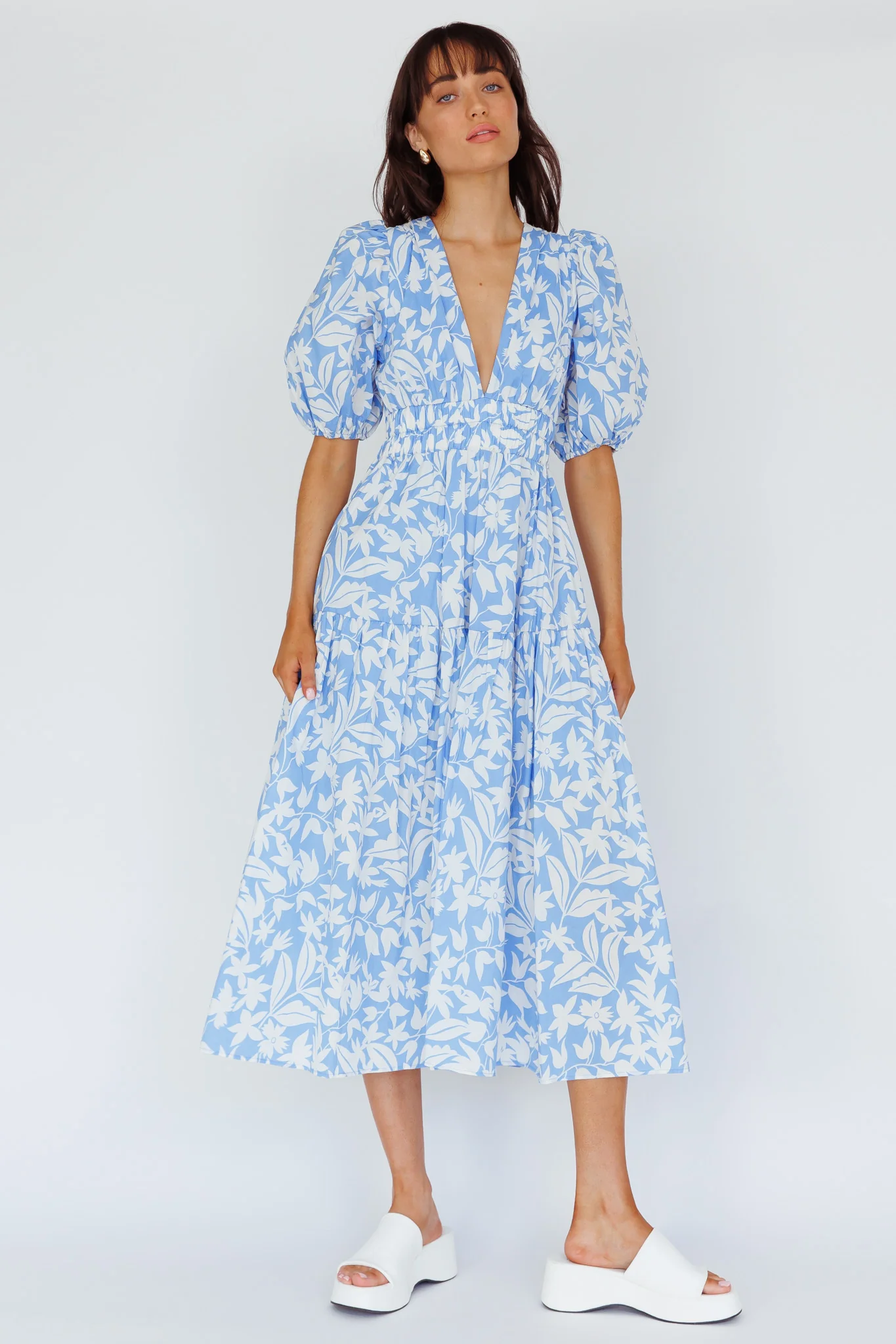 Summer Land V-Neckline Midi Dress Floral Blue