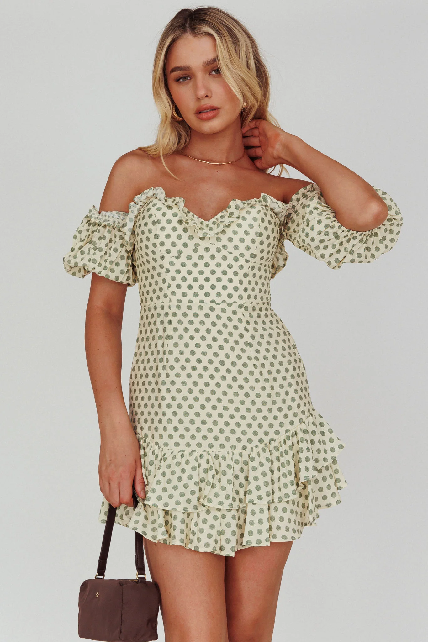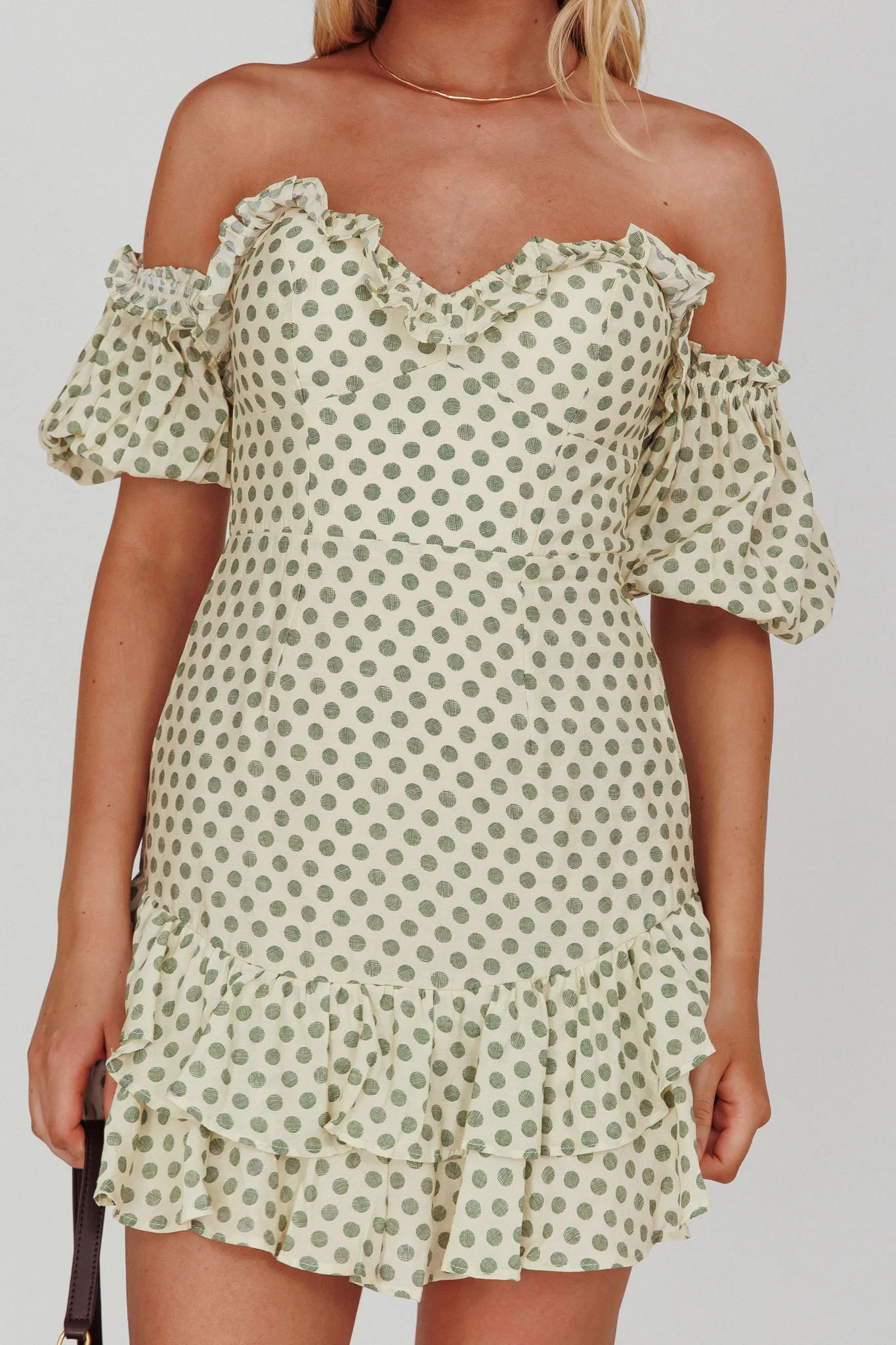 Homecoming Queen Sweetheart Neckline Puff Sleeve Dress Polka Dot Green