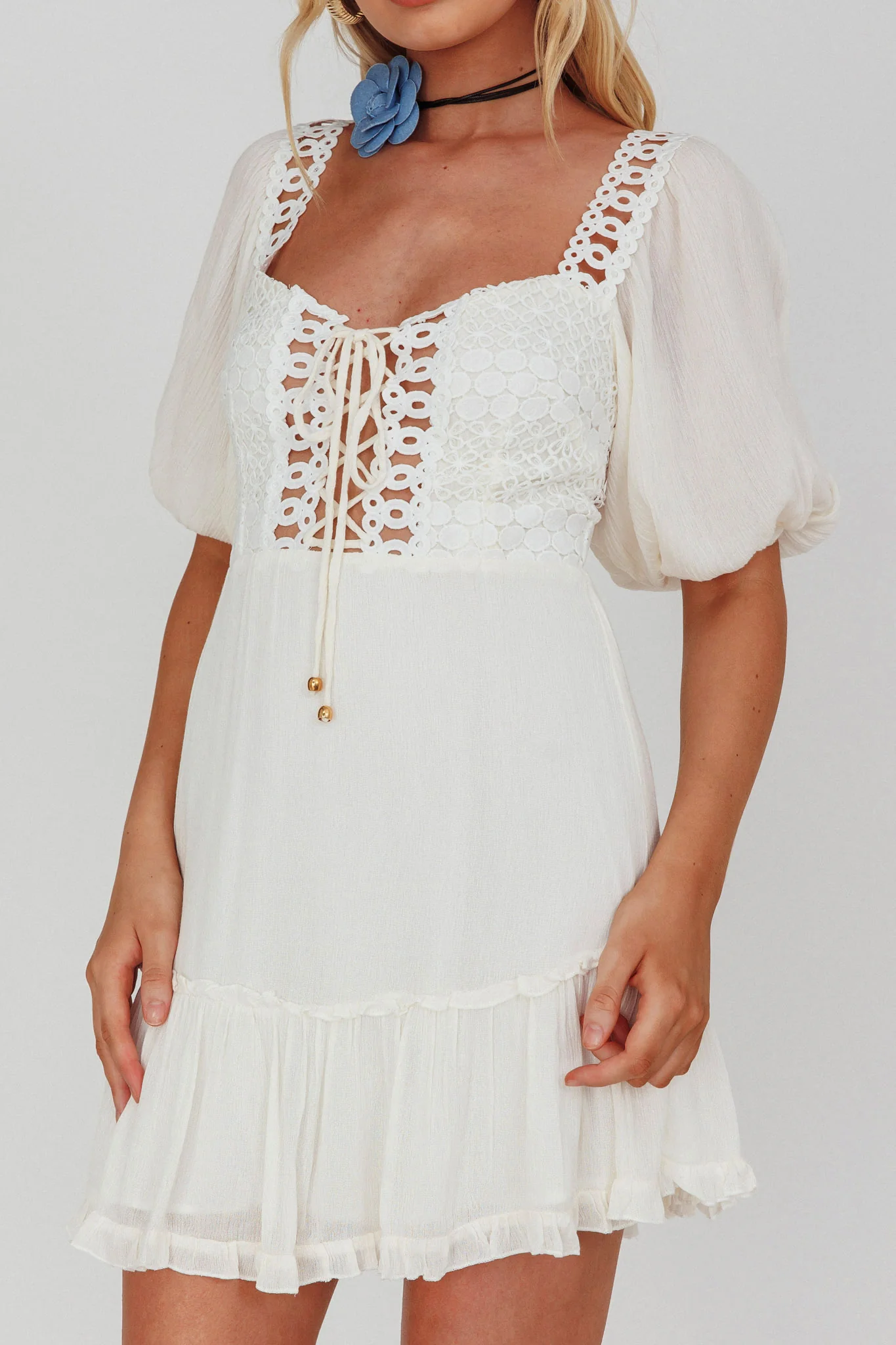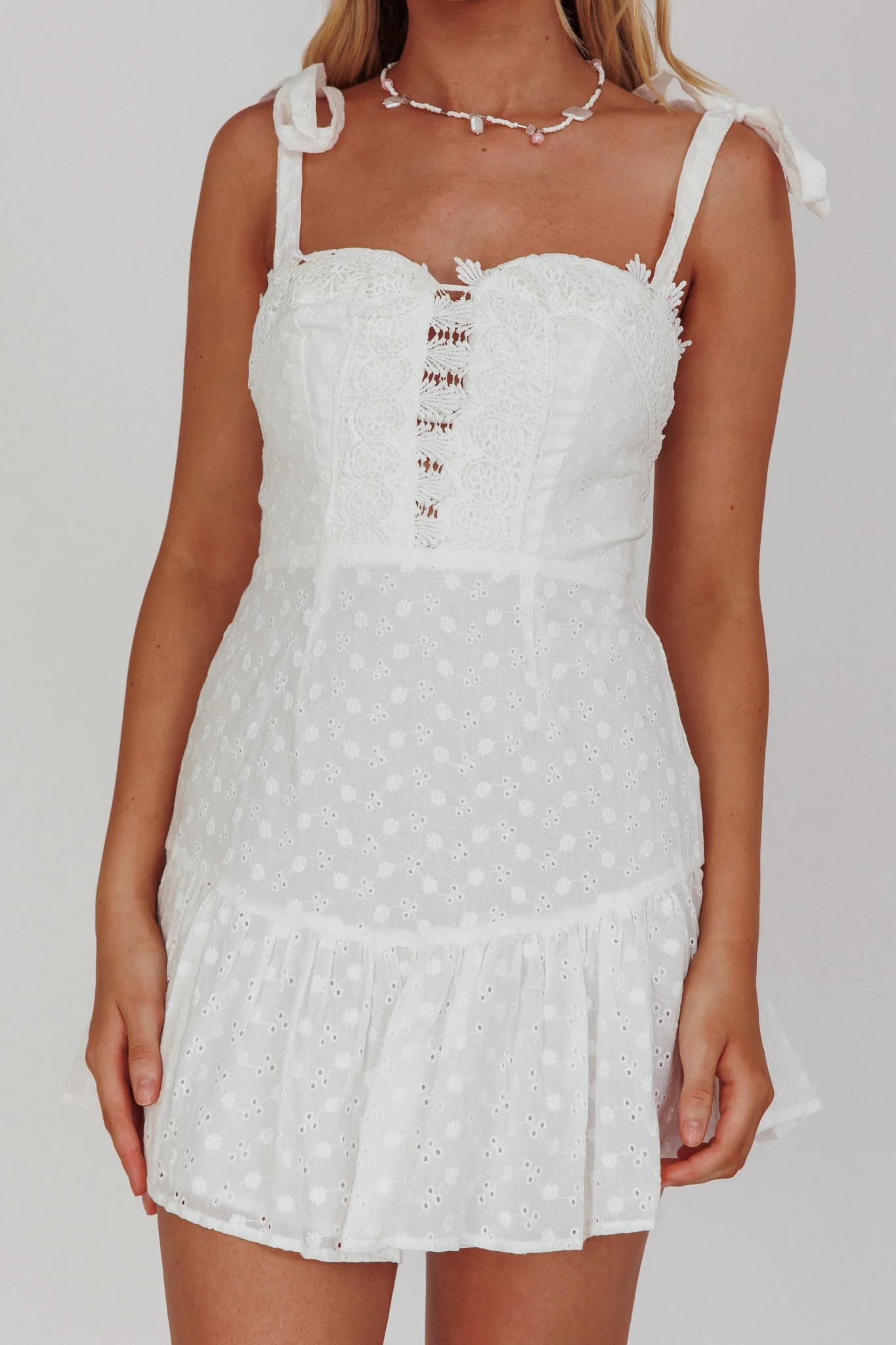 Kelsie Tied Shoulder Eyelet Mini Dress White