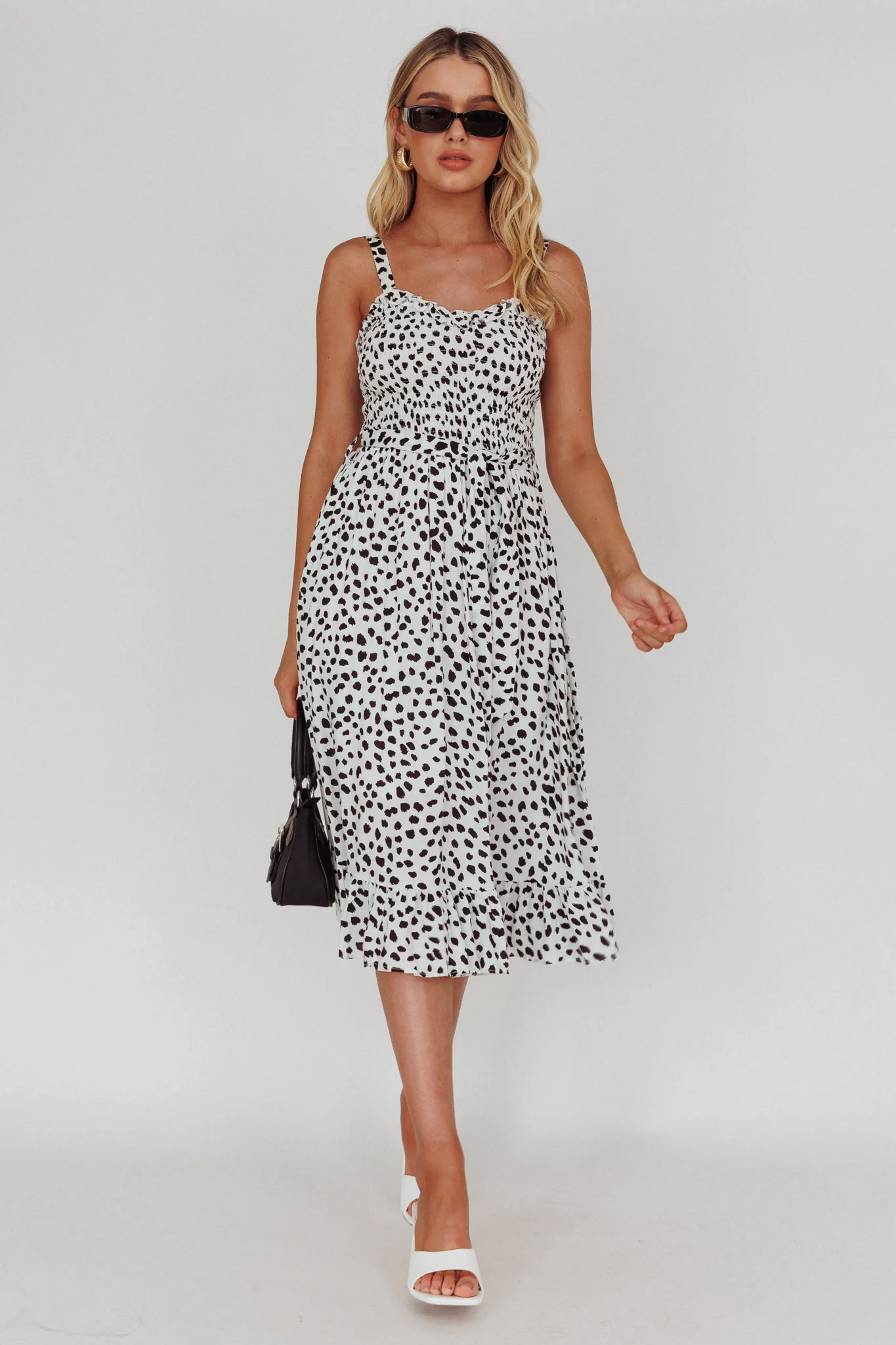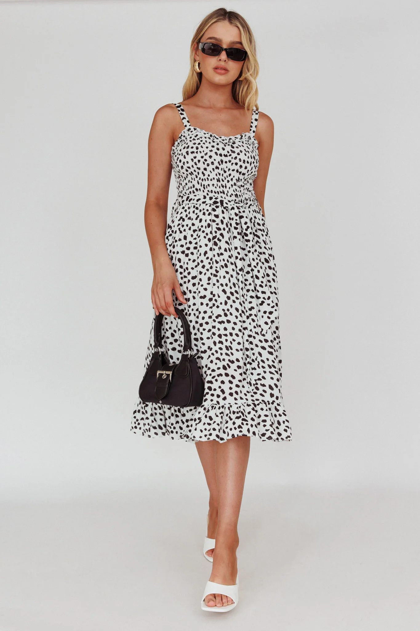 Honey Shirred Frill Midi Dress White/Black