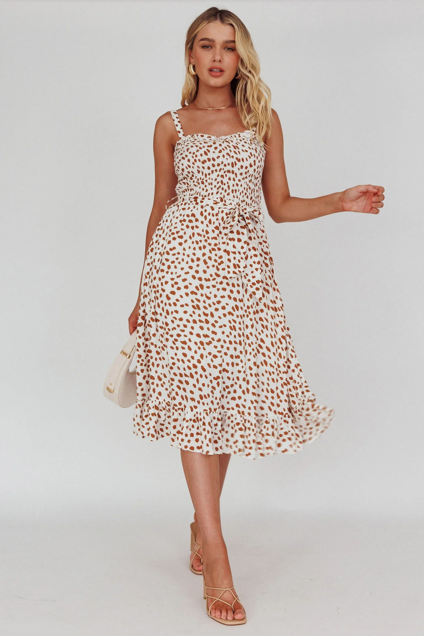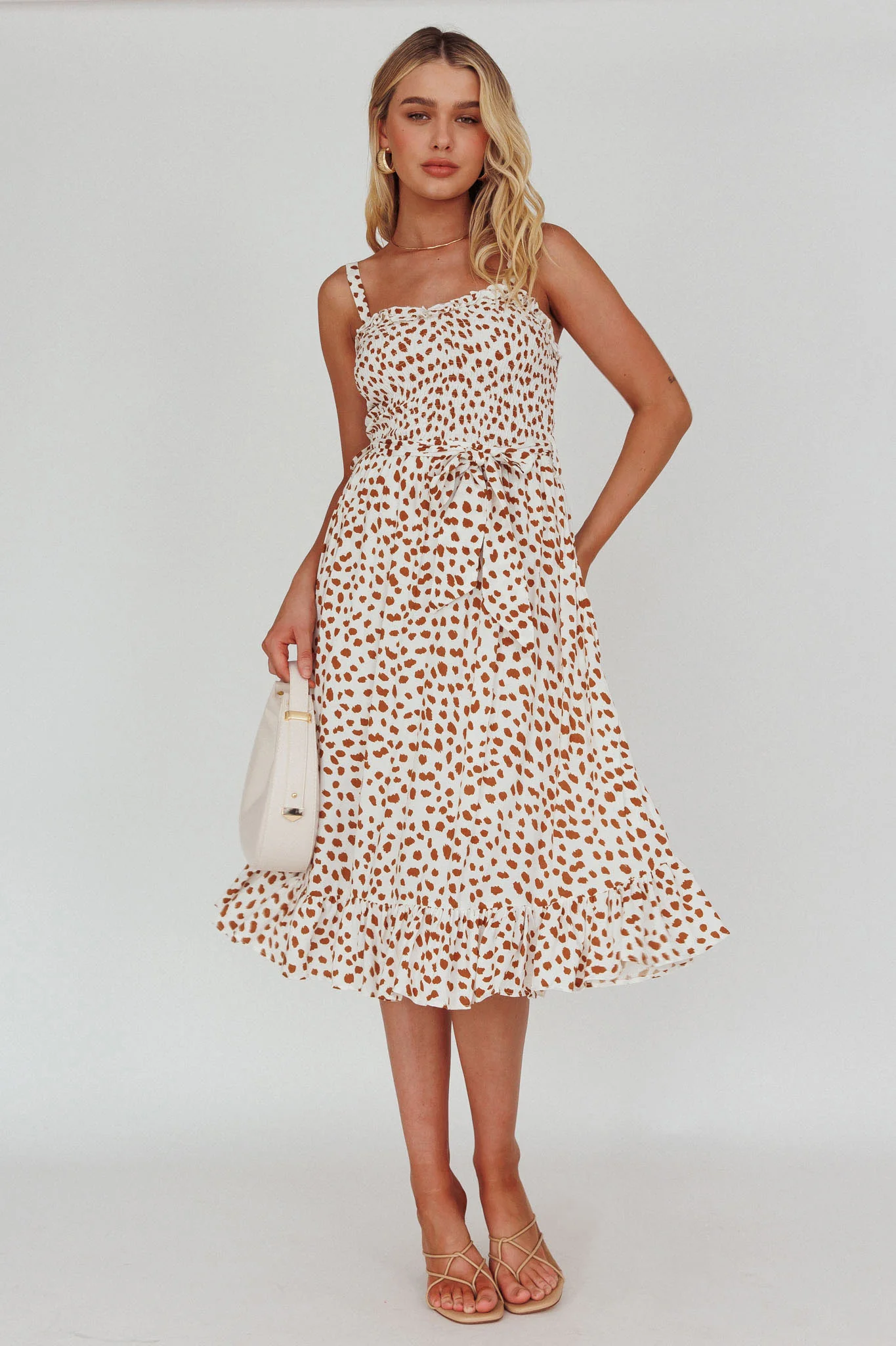Honey Shirred Frill Midi Dress White/Brown