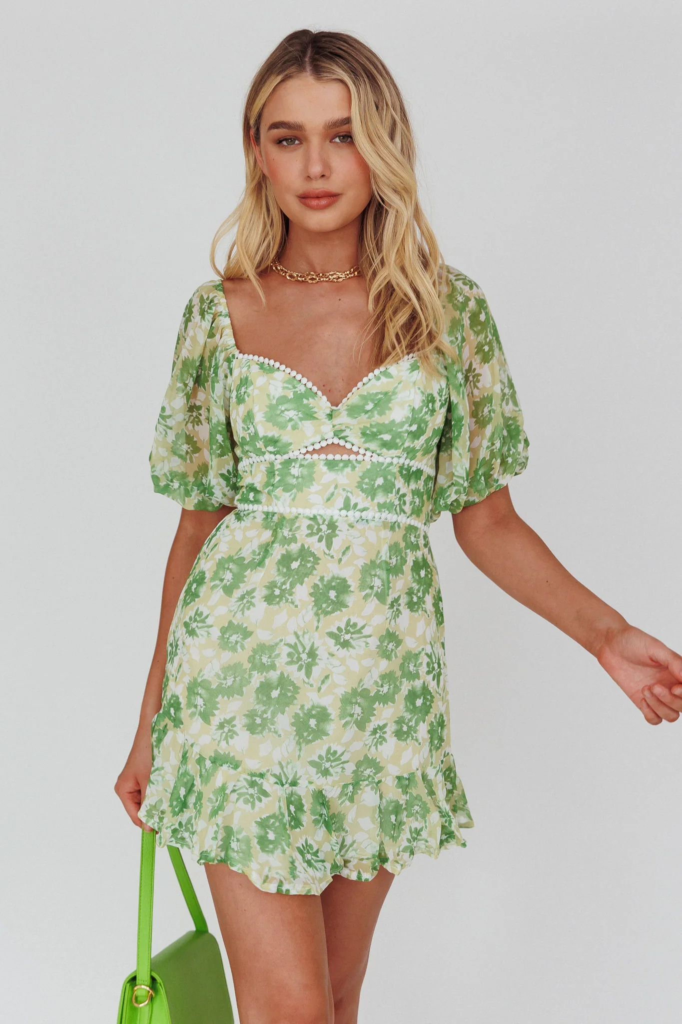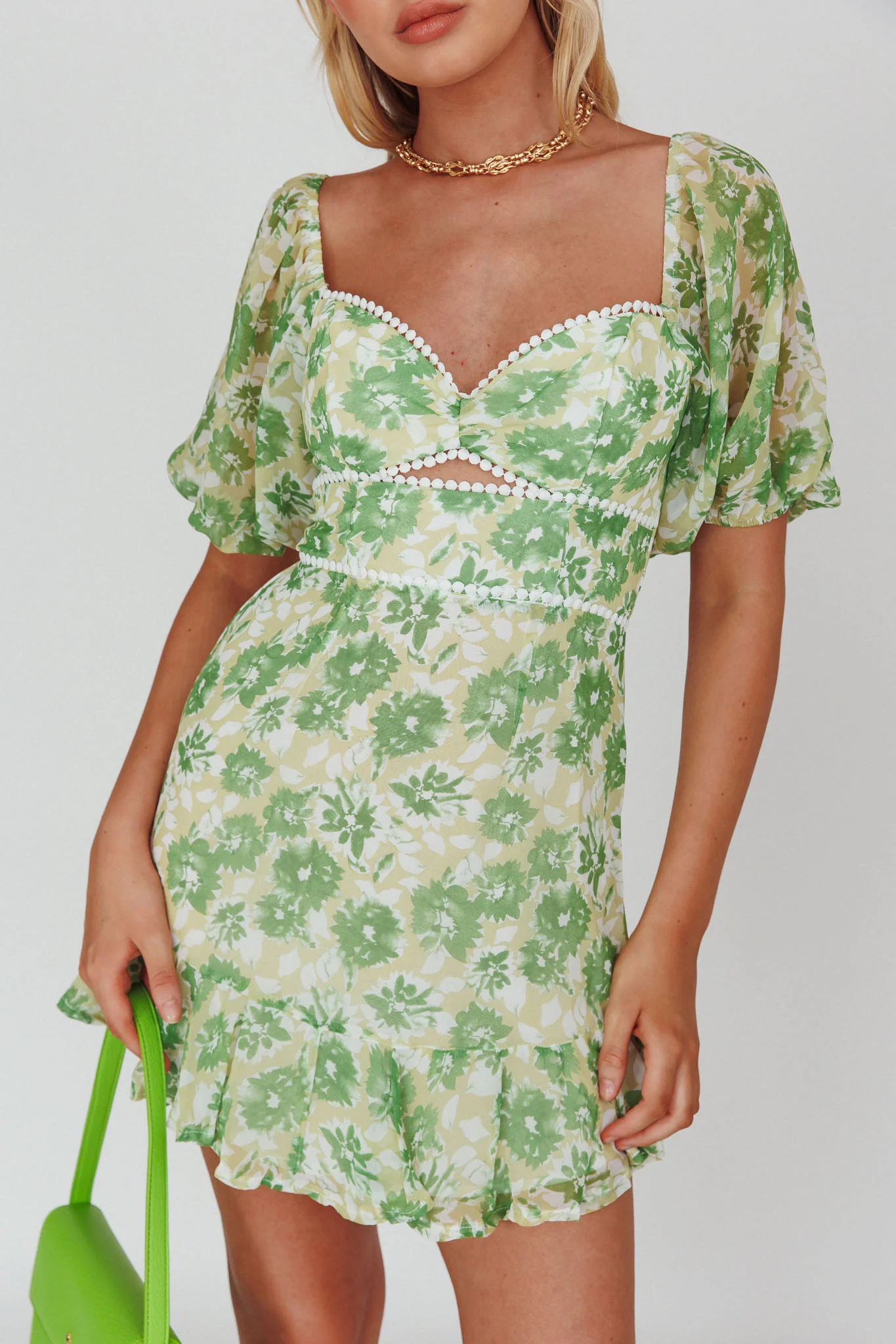Catch Feelings Sweetheart Neckline Dot Trim Dress Floral Green