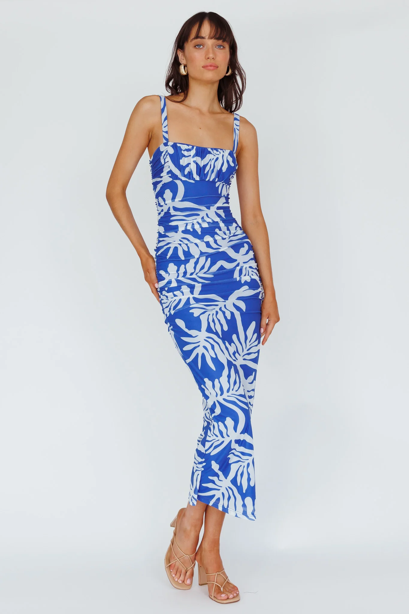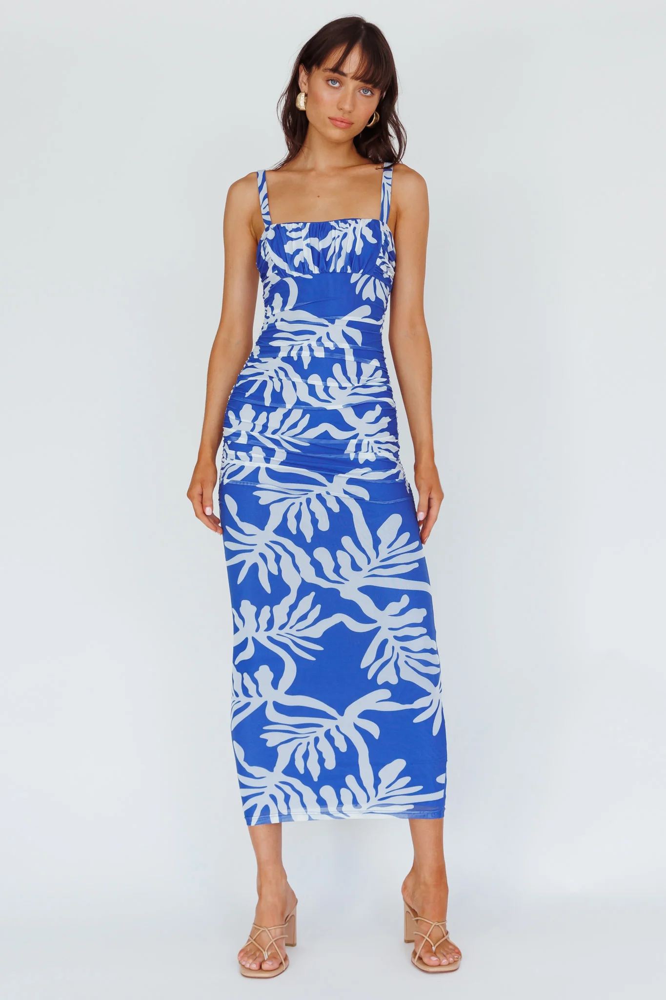 Hawaiian Sun Ruched Bust Midi Dress Print Blue