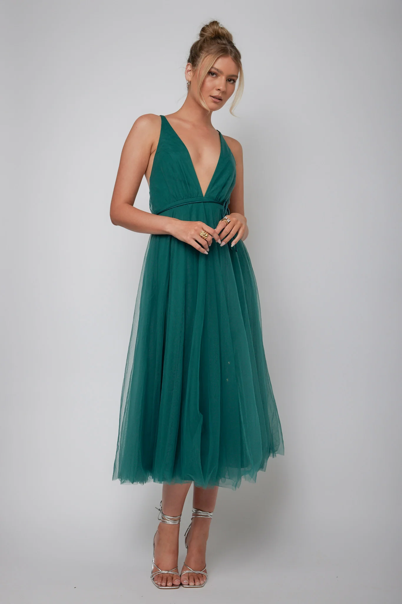 Floating By Plunging Neckline Mesh Overlay Midi Dress Forest Green
