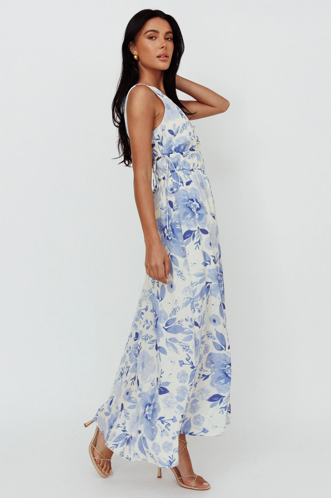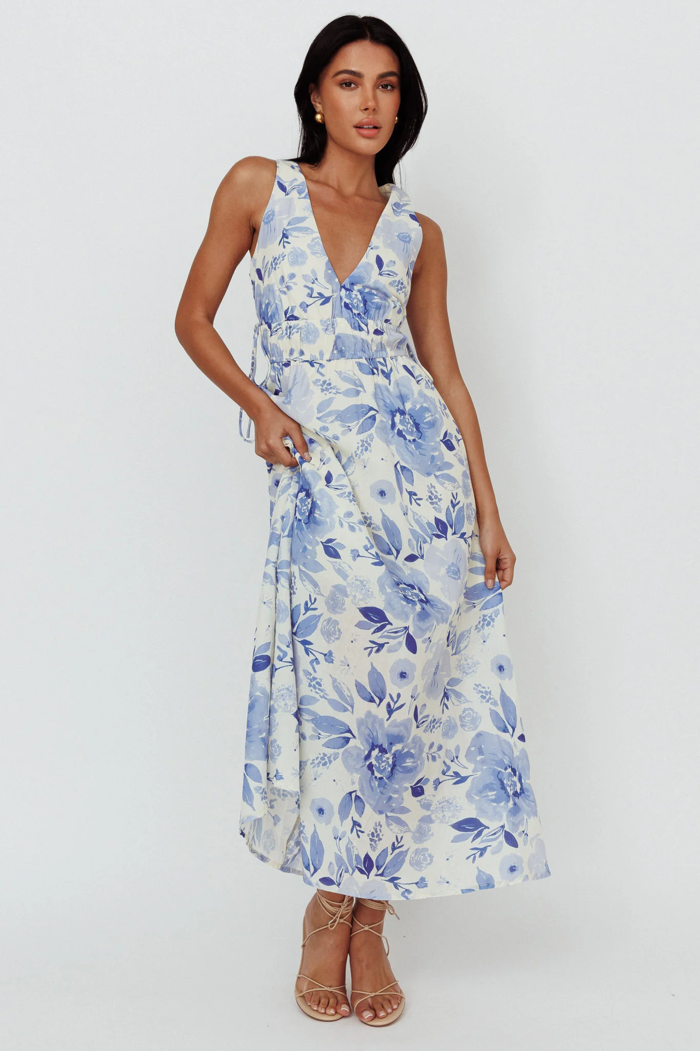 Perla V-Neck Drawstring Maxi Dress Floral Blue