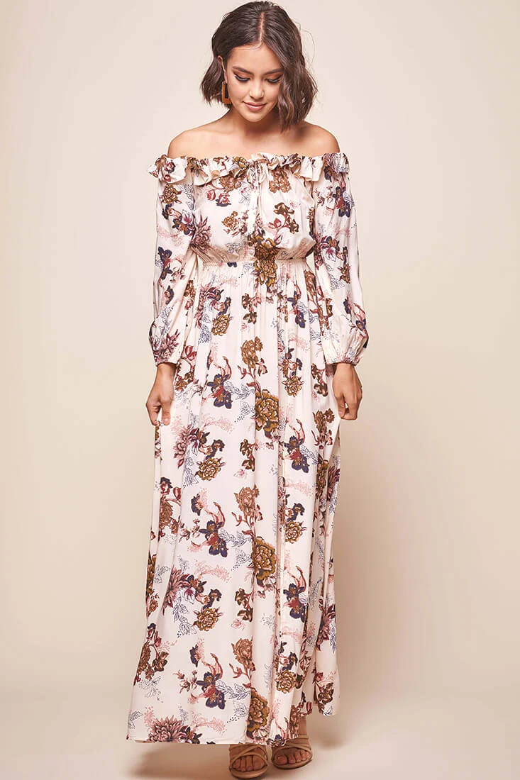 Tatiana Bardot Frill Neckline Maxi Dress Mocha
