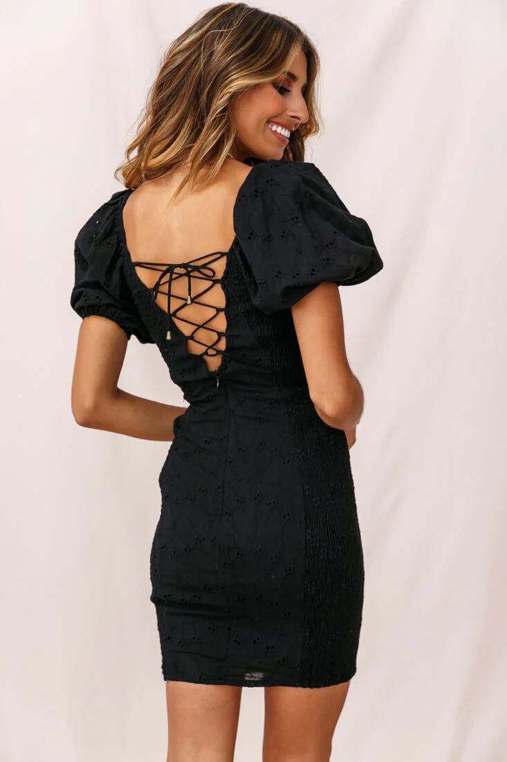Darling Puff Sleeve Shirred Dress Black