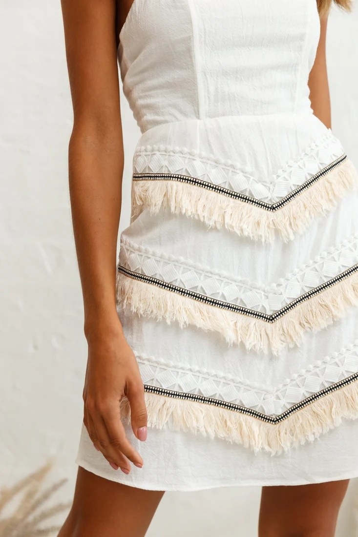 Polly Bardot Embroidery Fringe Dress White