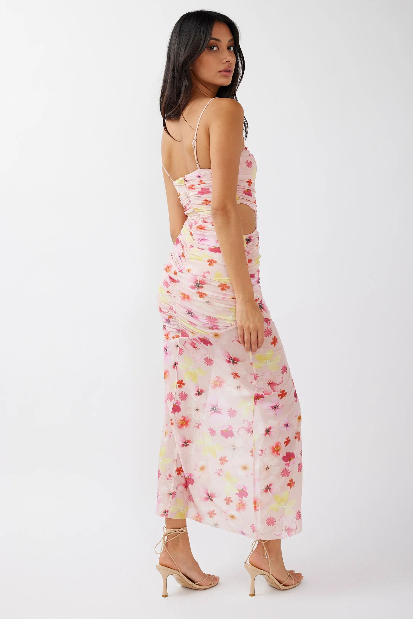 Kindred Soul Ruched Mesh Midi Dress Floral Pink