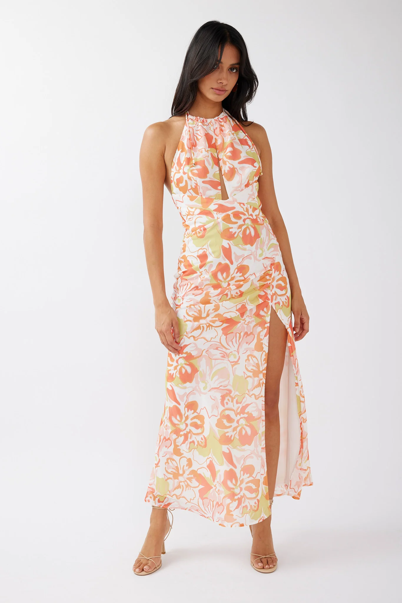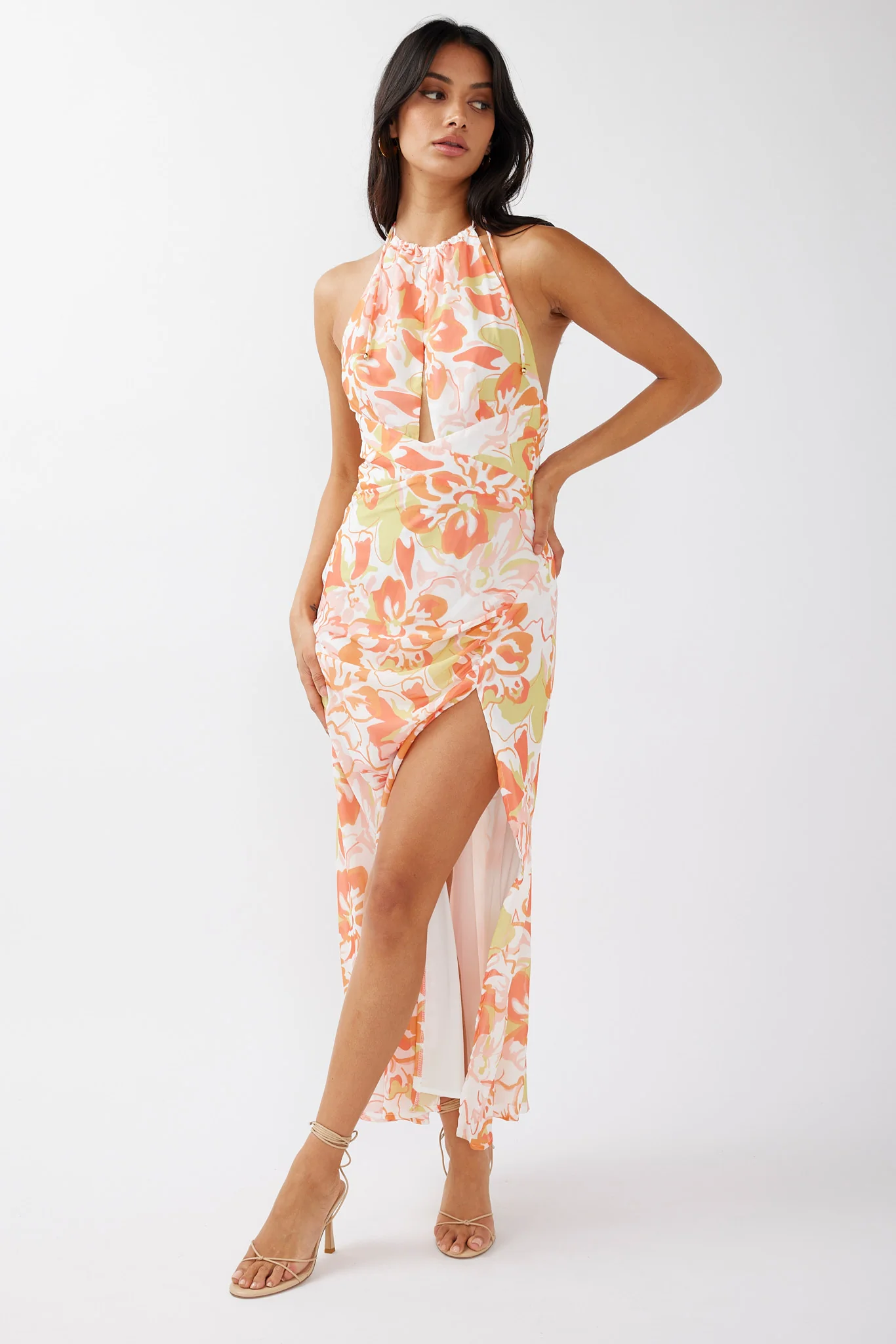 Nirvana Halterneck Split Midi Dress Floral Orange