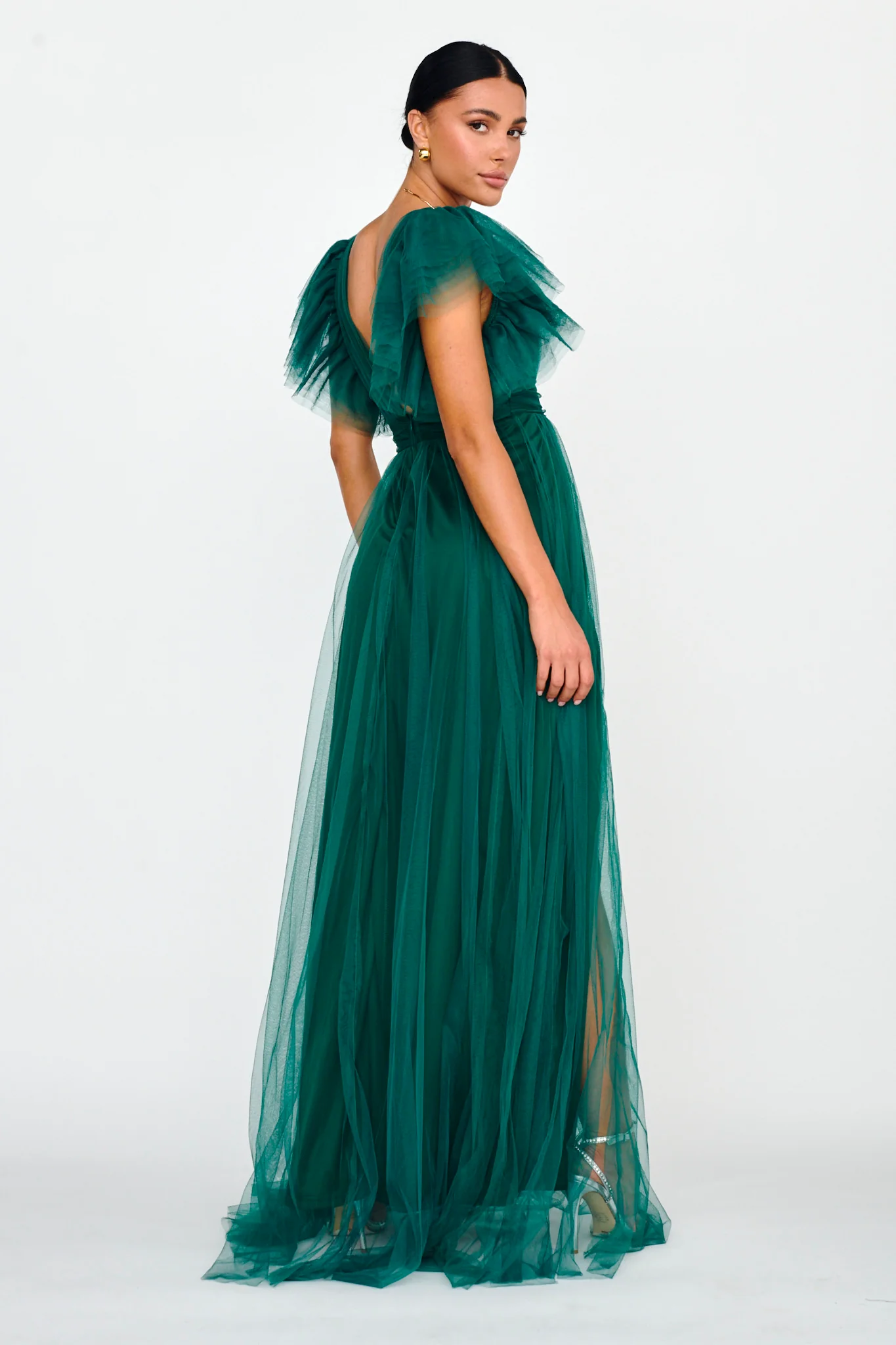 Heaven's Love Deep V-Neck Tulle Maxi Dress Hunter Green