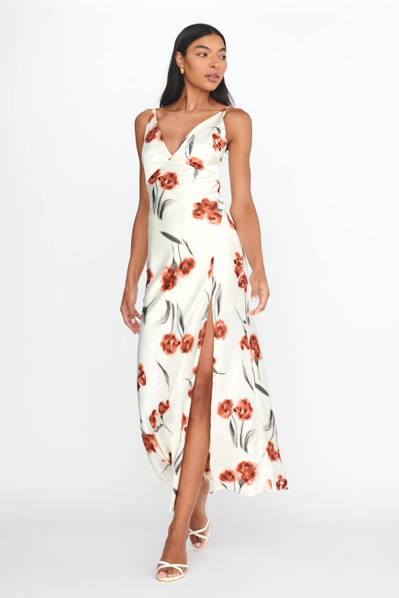 Nadia Ruched Fishtail Midi Dress Floral White