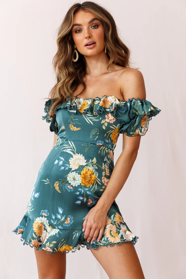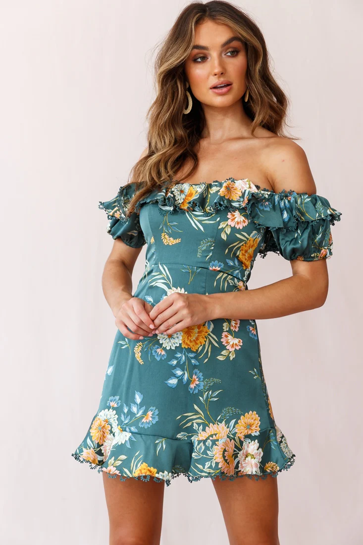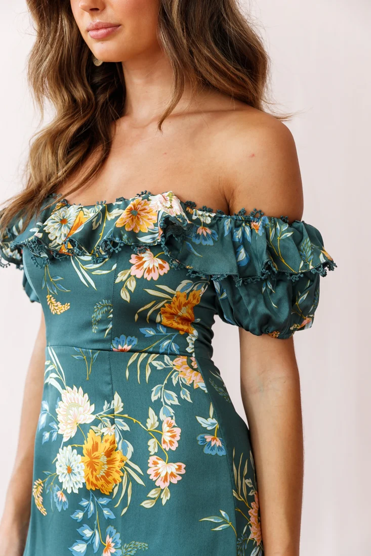 Bobby Bardot Neckline Puff Sleeve Dress Teal