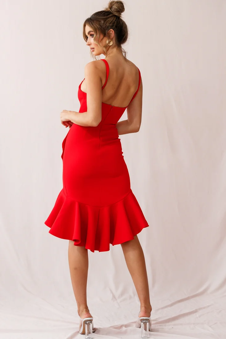 Riley Deep V-Neckline Ruffle Detail Dress Red