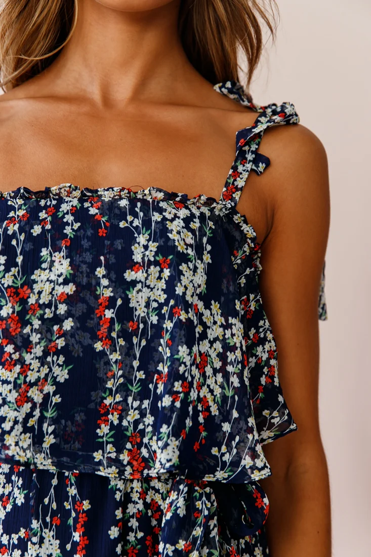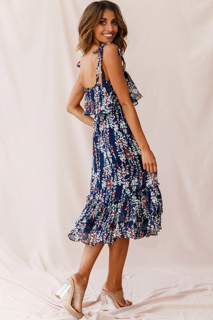 Maeve Shoulder Tie Layered Ruffle Dress Navy