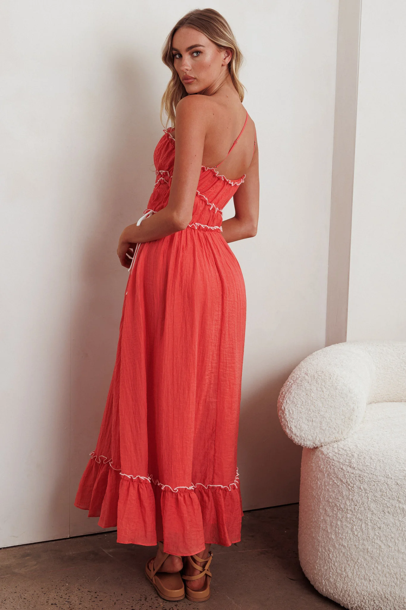 Paprika Tied Shoulder Shirred Midi Dress Red