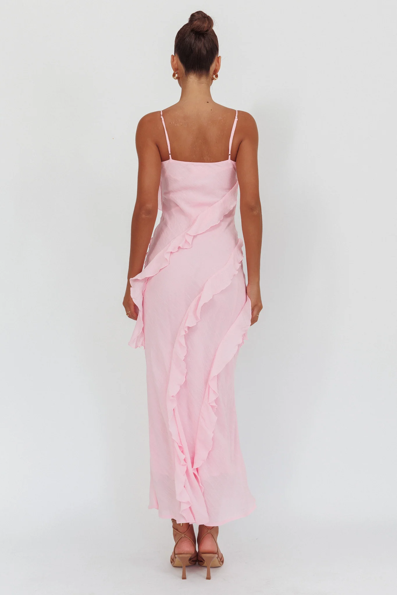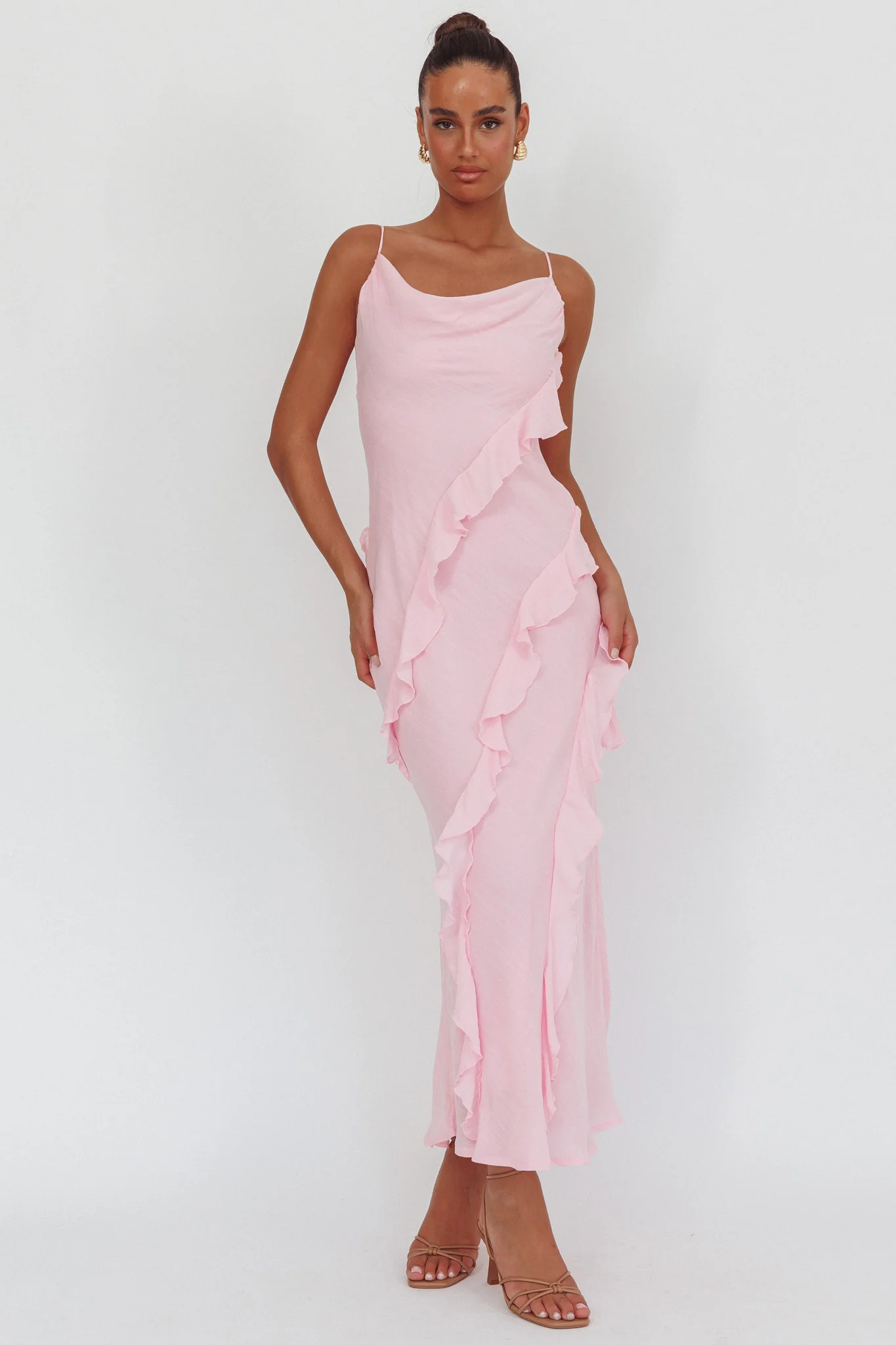 Panama Bay Ruffle Trim Cowl Neck Maxi Dress Pink