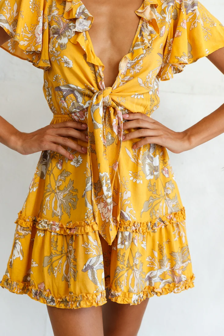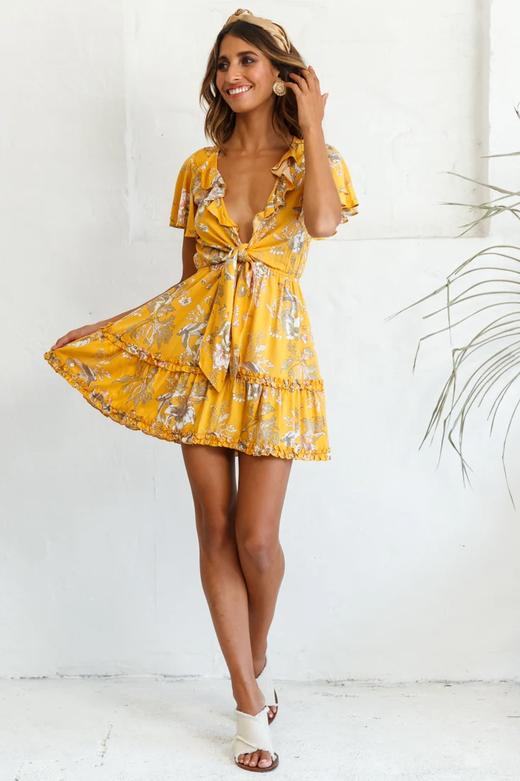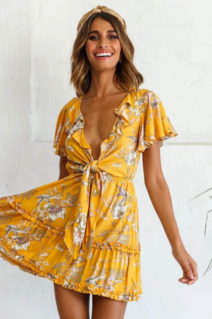 Sunny Daze Angel Sleeve Tie-Knot Bust Floral Print Dress Mustard